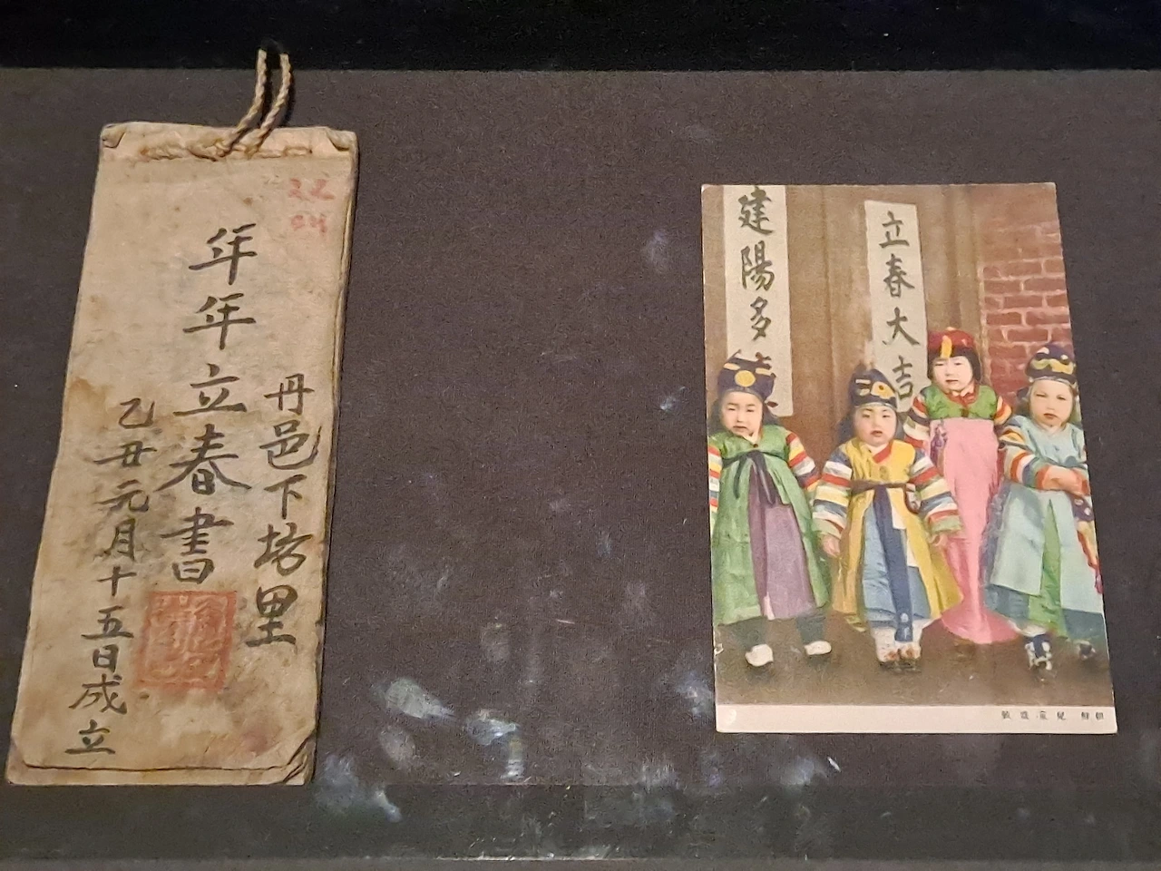 입춘 풍경 사진 엽서는 색동옷을 차려입은 아이들의 모습이 담긴 사진 엽서로, 대문에는 '입춘대길立春大吉', '건양다경建陽多慶'이라고 쓴 입춘첩이 붙어있다.