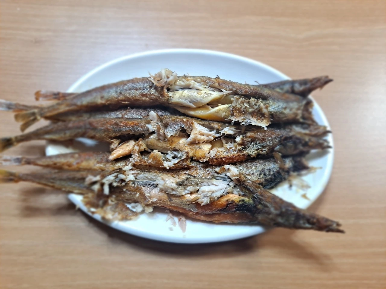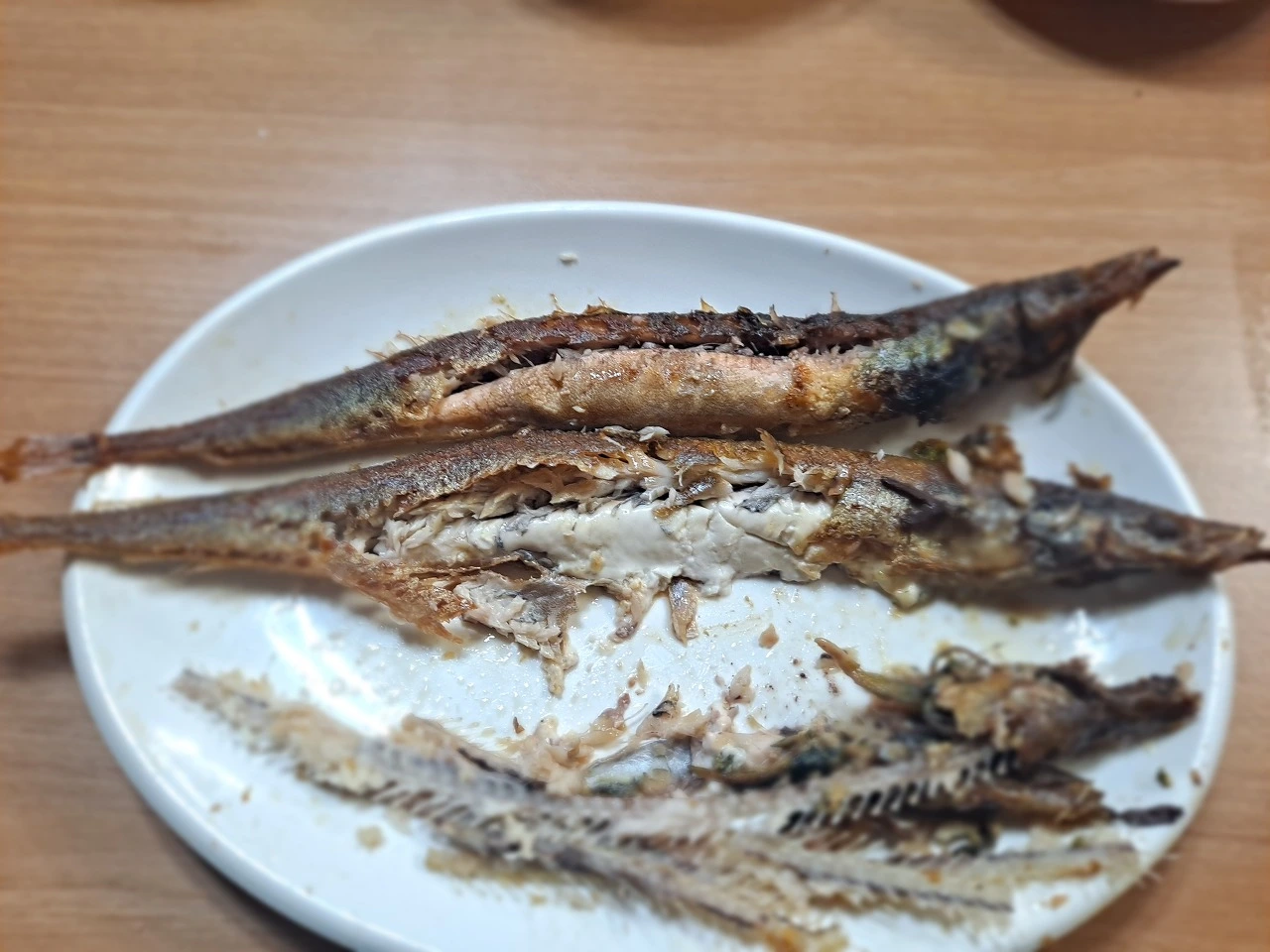 양미리구이는 소금 약간 뿌려 프라이팬에 튀기듯이 구워 내준다. 껍질이 노르스름한 것이 먹음직스럽다. 껍질을 살짝 발라보니 다양한 색깔의 알과 하얀 속살이 보인다.