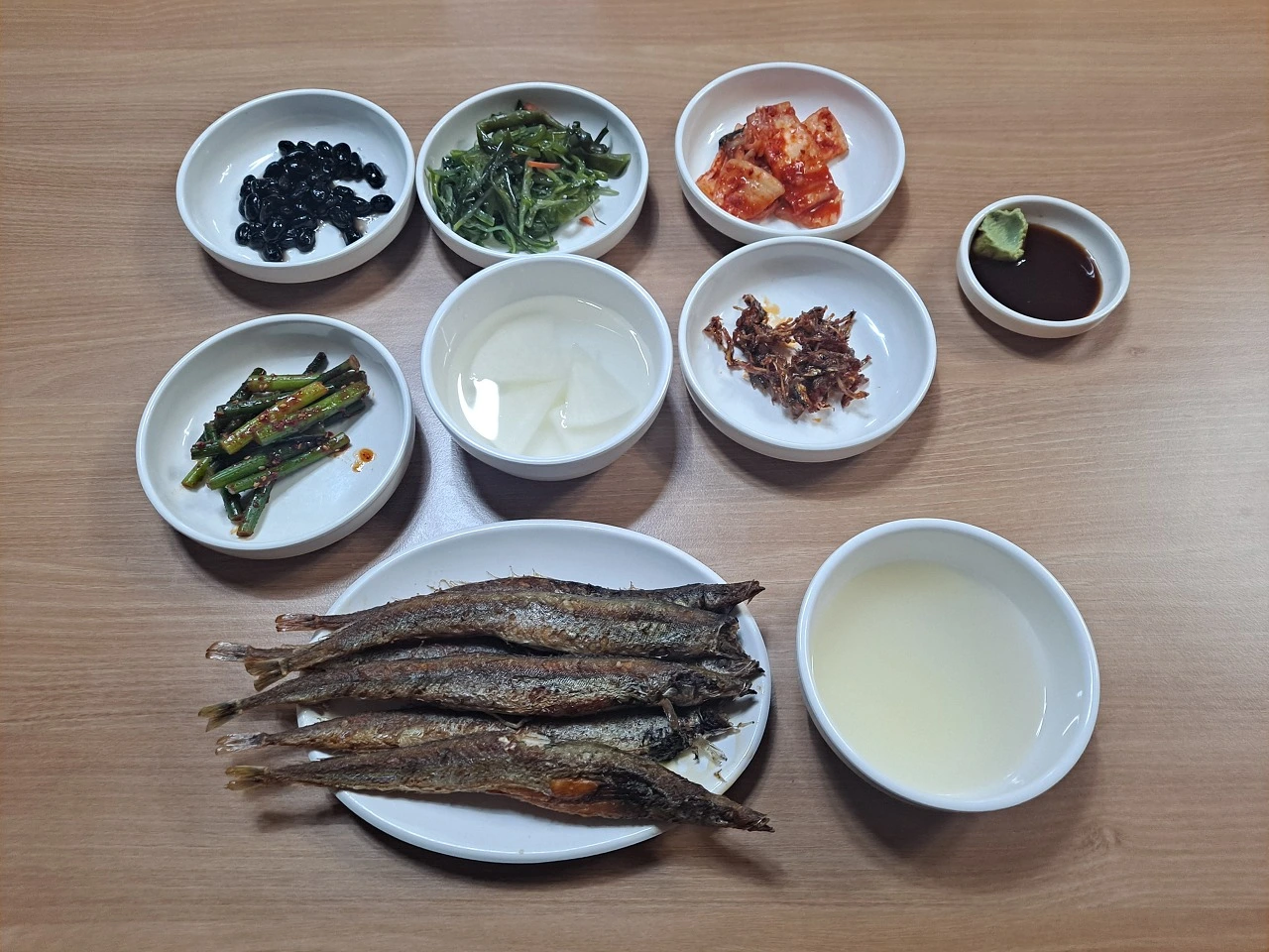 양미리구이와 막걸리를 주문한다. 콩장, 미역 줄기 볶음, 김치, 마늘종, 동치미, 멸치볶음, 고추냉이를 넣은 간장 등을 곁들여 내준다. 밥만 있으면 딱 백반 차림새다.