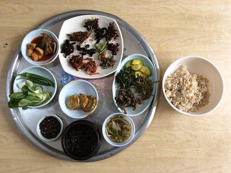 얼갈이배추, 오이, 고추, 깍두기, 얼갈이김치, 고추 무침, 메주콩 조림, 우엉조림, 해바라기 씨 넣은 고소한 멸치조림, 새우 넣은 마늘종 볶음, 포졸임, 무말랭이, 호박 나물, 돌미나리, 머윗대 무침, 시래기 무침, 호박전, 해바라기 씨가 들어간 쌈장, 자연산 버섯 장아찌, 개복숭아 장아찌, 더덕장아찌, 산 뽕잎 장아찌, 비빔밥에 비벼 먹는 용도의 두부, 파, 버섯 등을 넣은 강된장 등 밑반찬과 국을 대신한 채 썬 오이, 고추, 양파를 넣은 새곰하고 시원한 오이 냉채를 보리밥과 함께 먹는다.