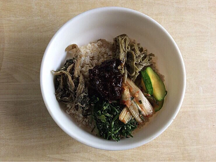 가슬가슬 통통한 보리밥과 약간의 쌀밥이 담긴 대접에 삼삼하게 무친 돌미나리 무침, 졸깃하고 구수한 시래기 무침, 머윗대 무침, 얼갈이김치, 호박 나물을 담고 두부, 파, 버섯 등을 넣은 강된장으로 비빈다.