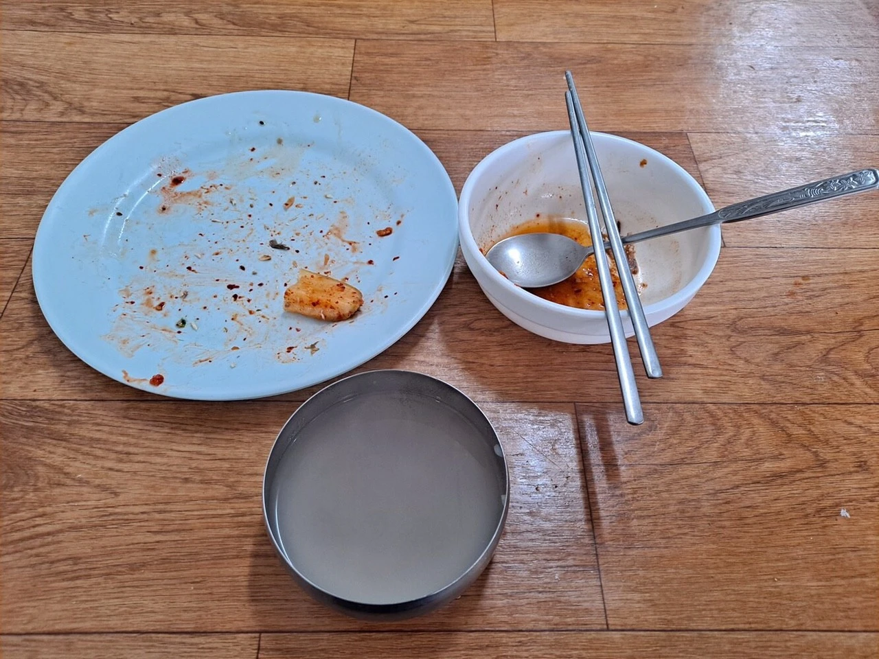 양미리를 빼면 절밥과 다르지 않다. 싹싹 비우고 구수한 숭늉으로 식사를 마무리한다. 시장통에서 맛본 두 번째 삼천 원의 행복한 밥상이다.
