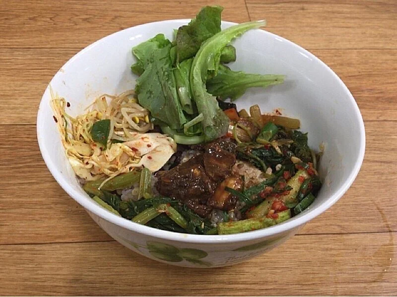 콩을 넣어 약간 질게 지은 보리밥에 밑반찬으로 나온 콩나물무침, 양배추 무침, 고구마 줄기, 오이무침, 부추 무침, 나물무침, 달걀프라이, 연한 상추를 담아 짭짤한 막장, 고추장, 된장 국물을 조금 넣어 비빈다.