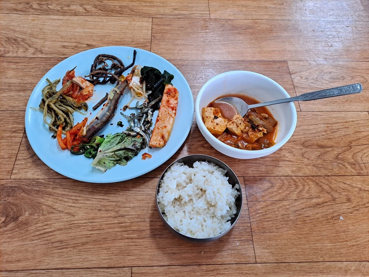 된장국이 진하고 구뜰하다. 보리 밥알이 부드럽게 씹히는 구수한 숭늉으로 식사를 마무리한다. 세 번째 맛본 수수하고 흐뭇한 삼천 원의 밥상이다.