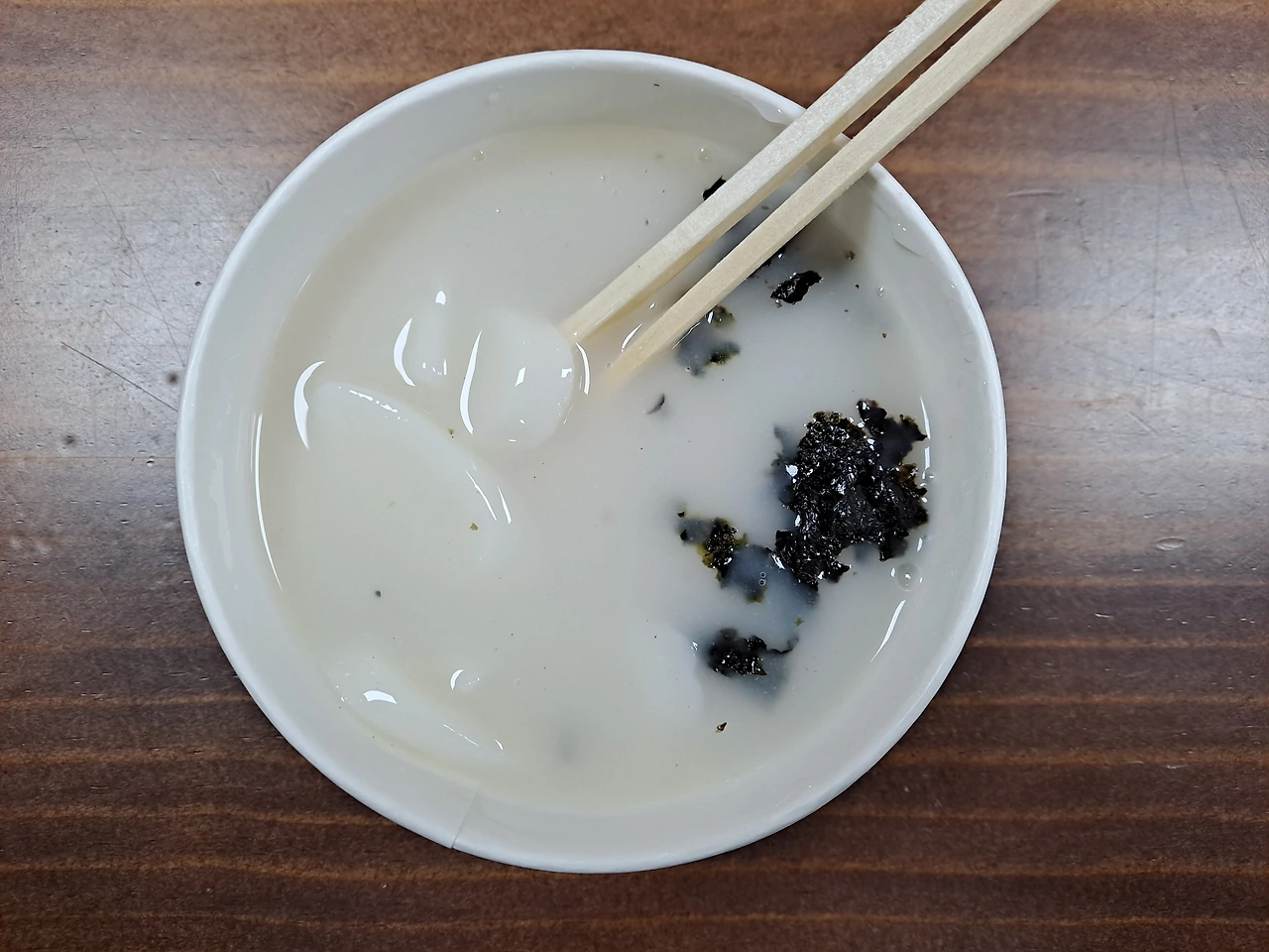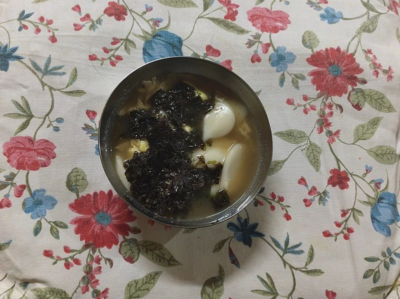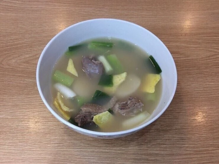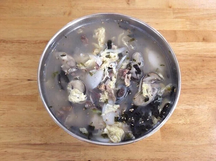잡내 없이 짭조름하고 진한 풍미의 육수다. 별미 떡국이다. 신맛 덜한 깻잎절임, 부추 등을 넣은 오이무침 등을 곁들여 먹는다.