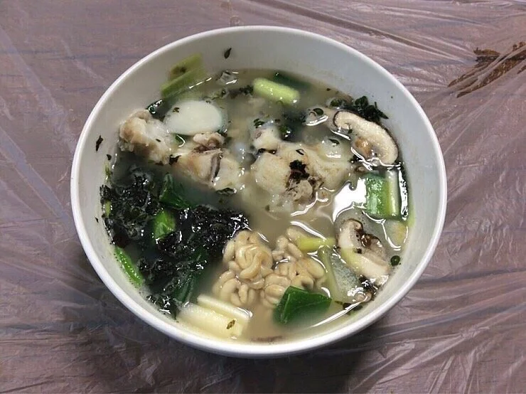 떡국은 무, 다시마, 버섯 등으로 우린 채수에 가래떡을 어슷하게 썰어 넣고 끓인 후 소금으로 간을 맞추었다. 뽀얀 떡국점 위 검은 김이 대조를 이룬다. 고명은 조미하지 않은 김 가루뿐이지만 모자람이 없다.