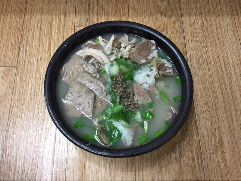 검은 뚝배기에 밥을 담고 돼지머리 고기, 간, 오소리감투 등을 체에 넣어 따뜻한 국물에 데워 뚝배기 밥 위에 얹는다. 국자로 돼지 사골과 머리뼈로 뽀얗게 우려낸 깔끔하고 구수한 국물을 몇 차례 토렴하고 썬 대파, 부추, 들깻가루를 살짝 뿌려 내준다.