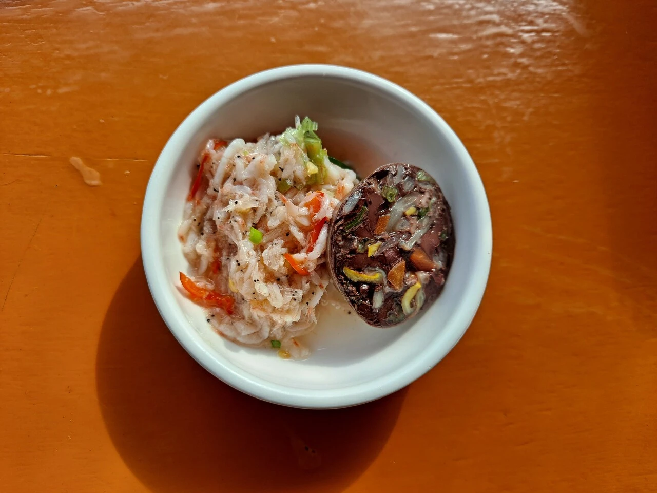 피순대는 대창에 선지와 콩나물, 당근, 파 등 채소로 속을 가득 채웠다. 삶을 때 꼬챙이로 찌른 구멍 사이로 육수가 스며들어 퍽퍽함 없이 부드럽고 고소하다. 새우 모양이 또렷한 새우젓을 올려 먹는다. 담백한 피순대에 바다의 감칠맛이 포개진다. 피순대가 일품의 맛으로 변신하는 순간이다.