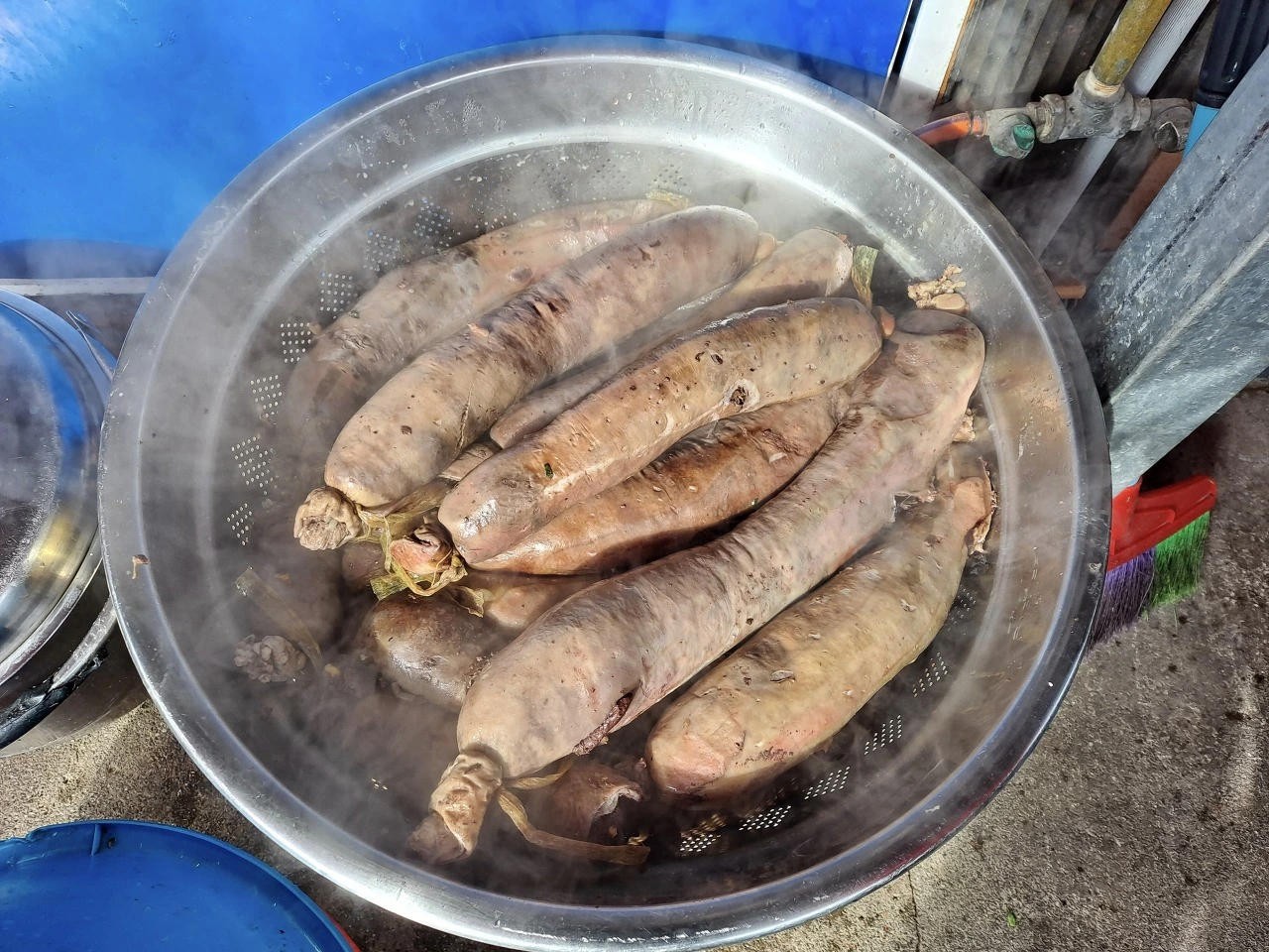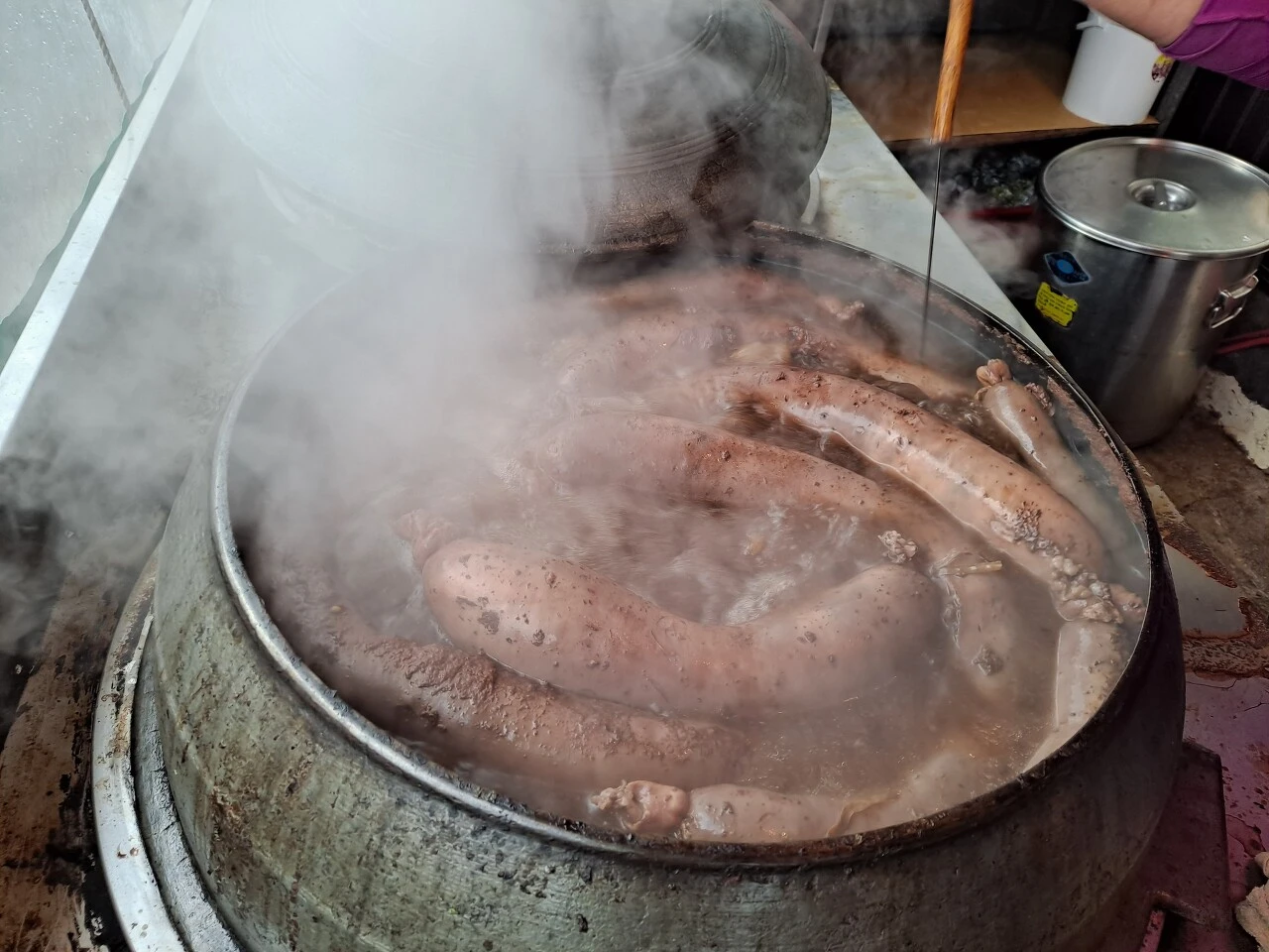 분홍빛의 커다란 대창 순대를 가마솥에 삶는다. 순대를 가느다란 꼬챙이로 콕콕 찌른다. 구수한 냄새를 품은 하얀 김이 모락모락 올라오며 코끝을 희롱한다. 순대가 터지지 않게 하려는 작업인듯 하다. 손이 많이 간다. 정성이 담긴 피순대다.