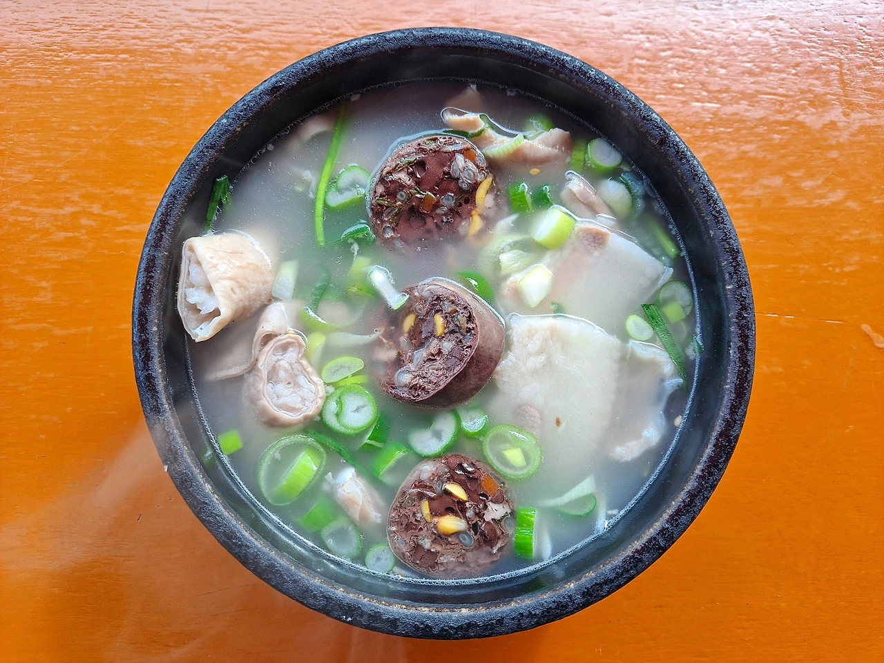 순대국밥을 주문한다. 뚝배기에 대창 피순대와 허파, 돈설, 돼지 귀, 새끼보, 간, 곱창, 머릿고기 등 돼지의 각종 부위를 골고루 담고 육수를 부은 후 썬 대파를 얹어 내준다. 다양한 식감과 맛이 뚝배기 한가득이다. 돼지 백화점이다.