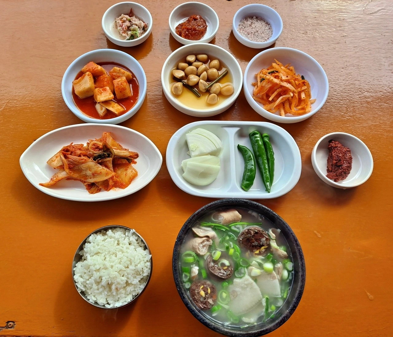 밥은 따로 공기에 담고 깍두기, 마늘장아찌, 무생채, 김치, 양파, 청양고추, 새우젓, 된장, 소금, 다진양념 등 밑반찬을 곁들여 먹는다. 신맛, 발효의 맛, 아린 맛, 매운맛, 구수한 맛, 감칠맛, 짠맛 등 다양한 맛과 식감이 밥과 순댓국에 잘 어우러진다. 허투루 만든 밑반찬이 없다.