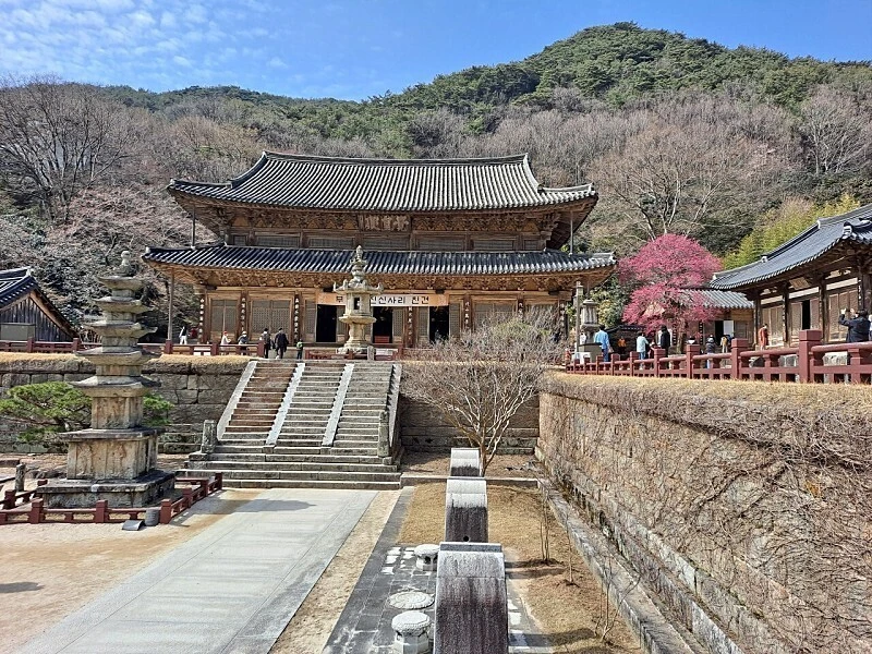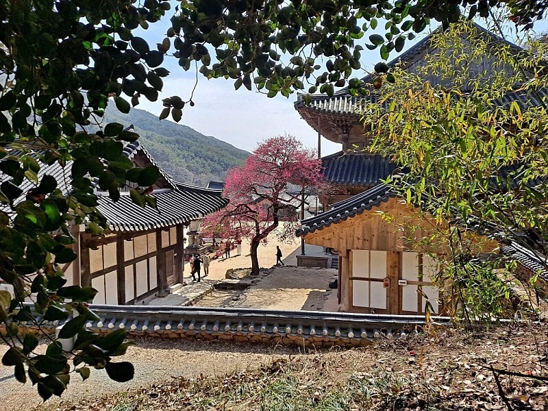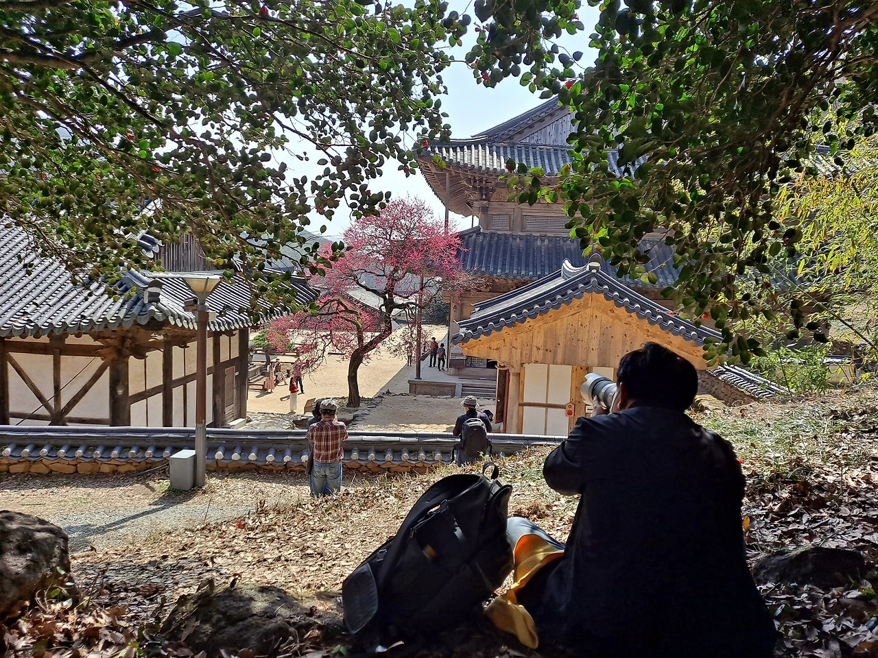 단청하지 않은 각황전 전각과 어우러져 화려함이 더 도드라진다. 화엄사의 상징적 건축물이자 우리나라에서 가장 큰 불전인 국보 각황전을 뒤로 밀려나게 할 만큼 진분홍빛 홍매화가 고혹하다. 지금 이 시기(3월 중순)를 놓치면 1년을 기다려야 다시 만날 수 있는 매화다.
