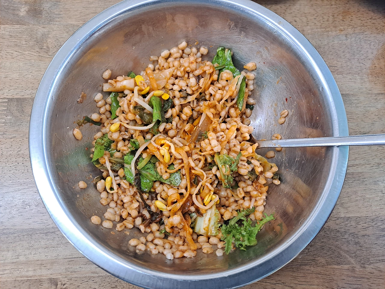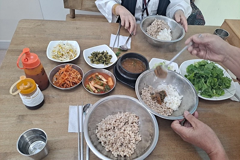 한술 크게 떠 맛본다. 자극적이지 않고 구수하다. 꺼끌하고 통통한 보리 밥알과 밑반찬들은 때론 따로 때론 합쳐지며 다른 식감과 맛으로 어금니와 혀를 놀린다.