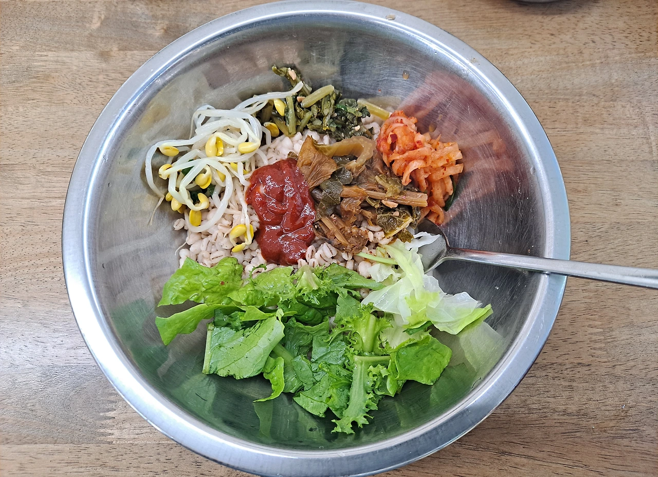 숟가락을 잡은 손이 자연스럽게 비빔을 시작한다. 진한 빨간빛이 꽁보리밥과 밑반찬에 스며들며 흐릿해진다. 푸른 채소와 노란 콩나물 대가리는 제 색을 잃지 않고 또렷하게 존재를 알린다.