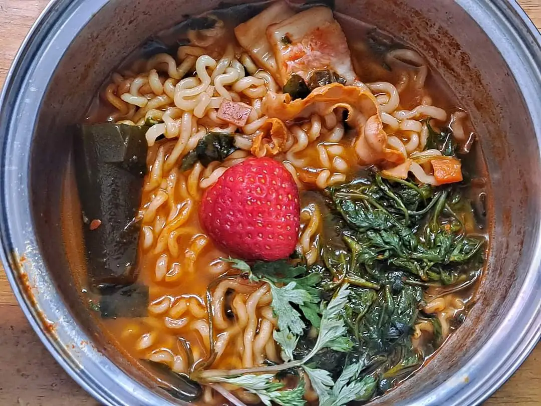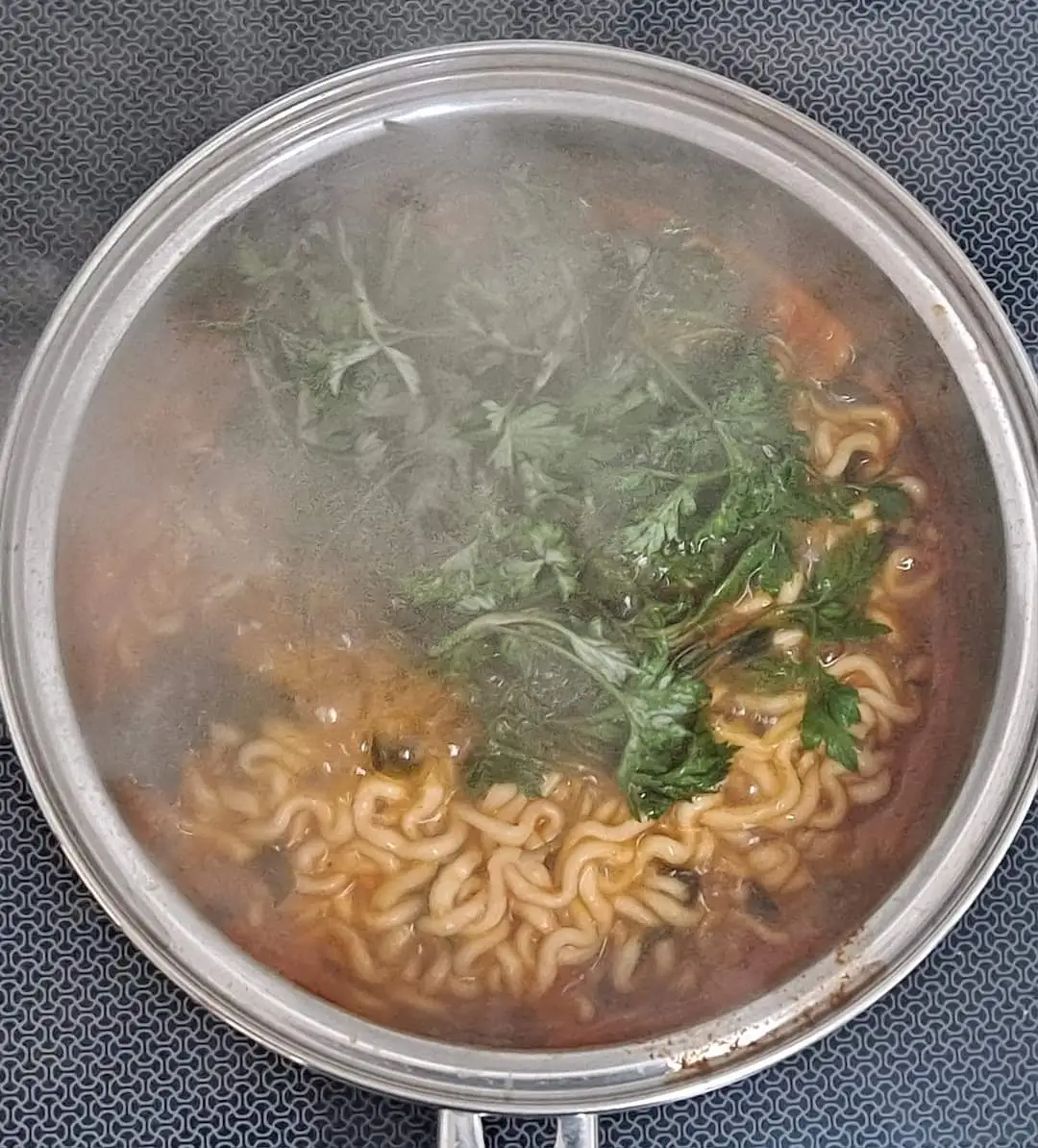 불을 끄고 마지막으로 쑥을 한 움큼 넣고 빨간 딸기 한 알도 고명으로 얹는다. 쑥라면이다.