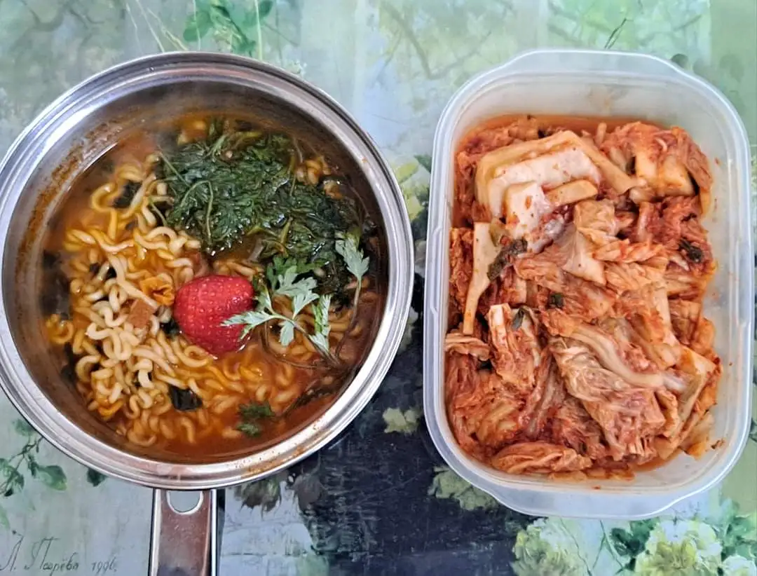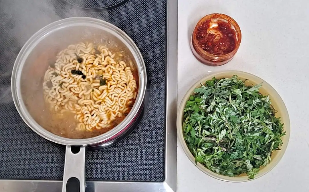 쑥라면에 김장 김치를 곁들여 먹는다. 묵은지의 시큼한 발효의 맛이 과학의 맛을 누그러뜨린다.