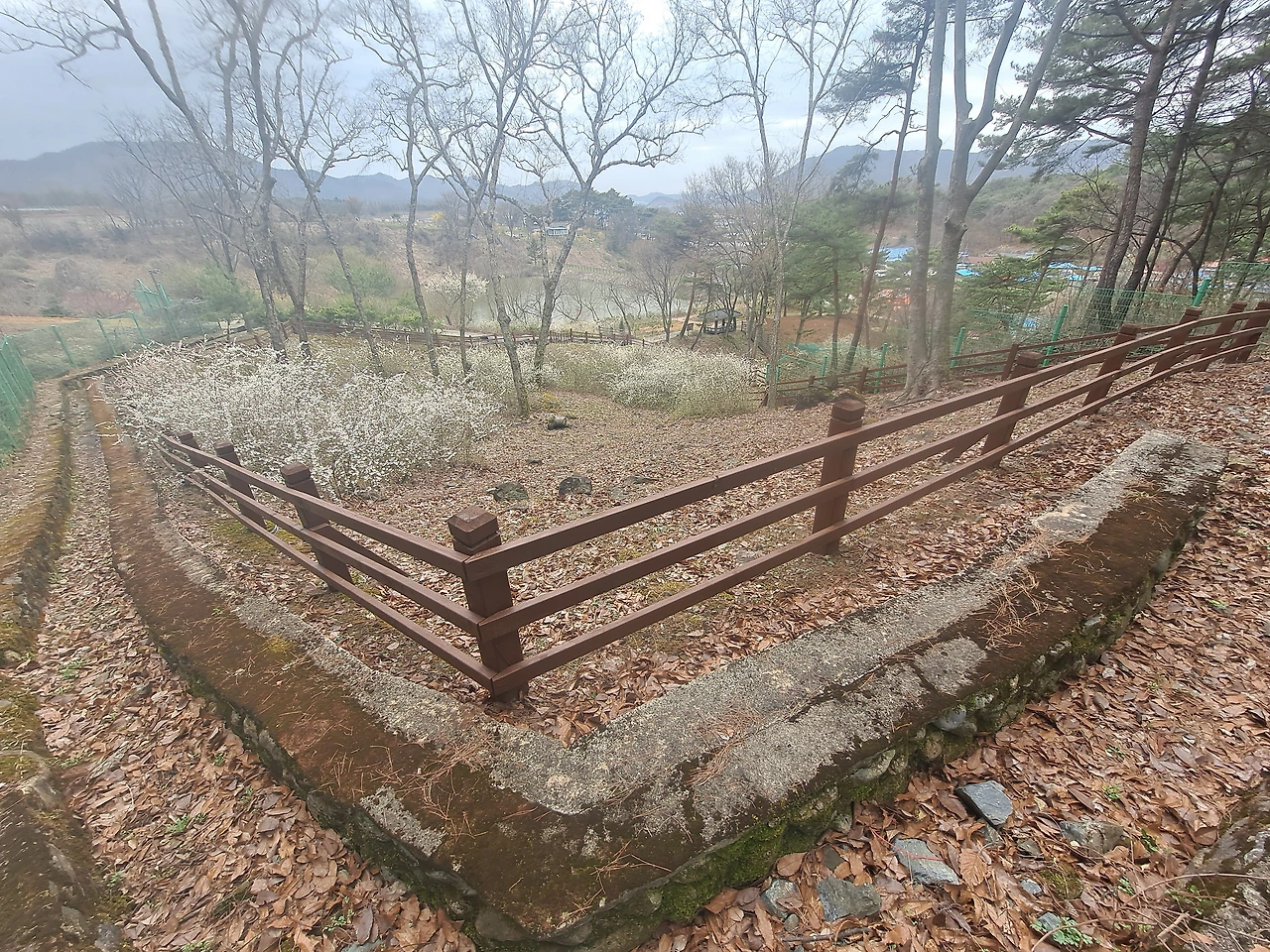 수전교를 지나 3.4km 걸어 천연기념물 괴산 율지리 미선나무 자생지를 찾아갔다. 율지리 미선나무 자생지가 있는 지곡마을로 향하는 2차선 도로에는 주말을 맞아 괴산 산막이 옛길과 괴산자연드림파크를 오가는 자가용과 관광버스들이 많다.