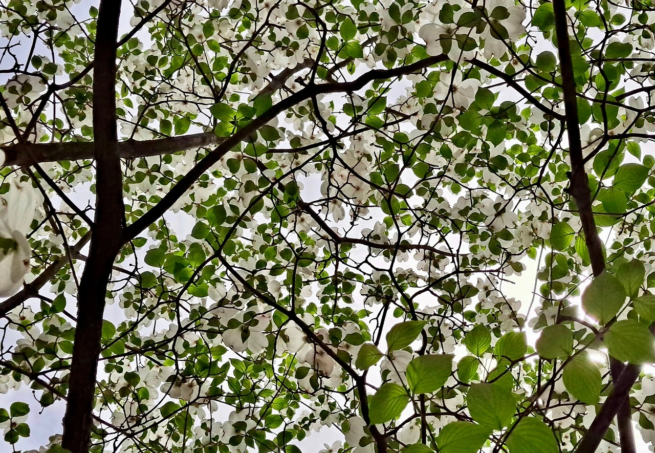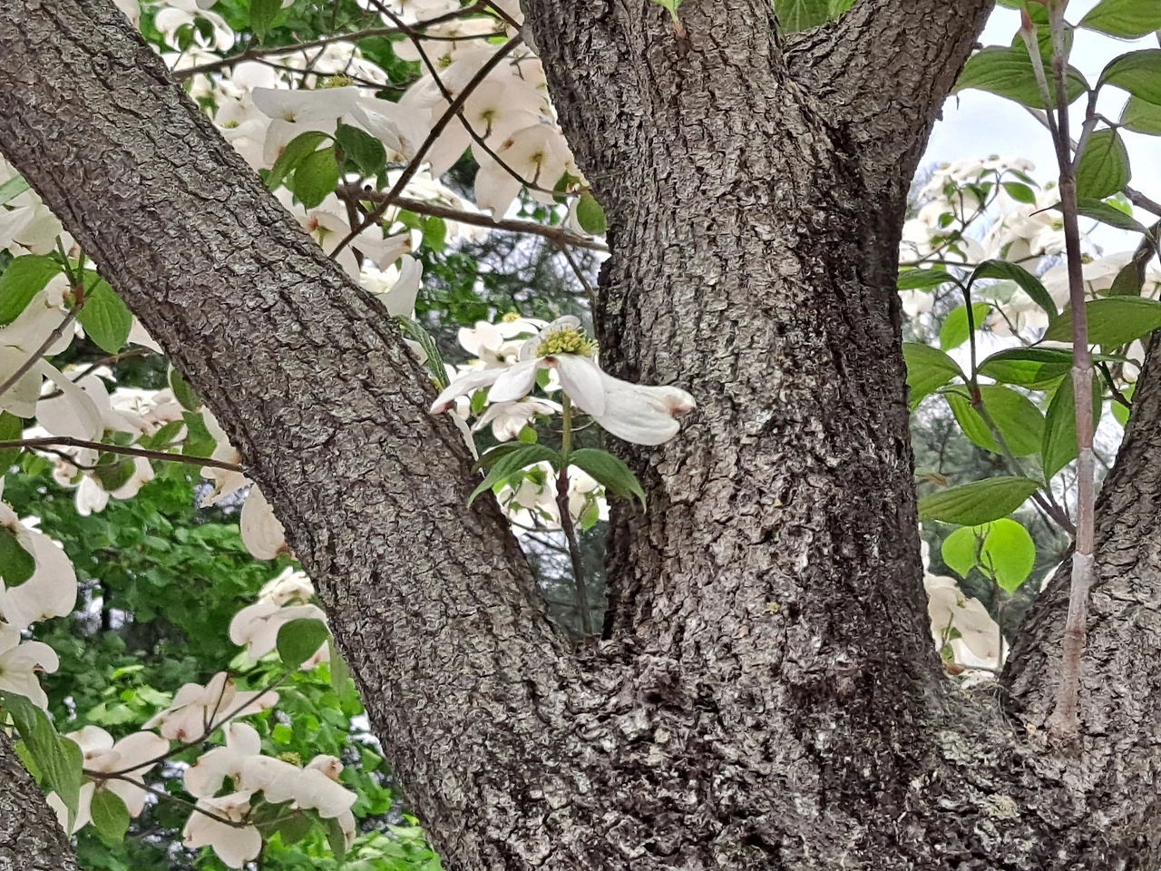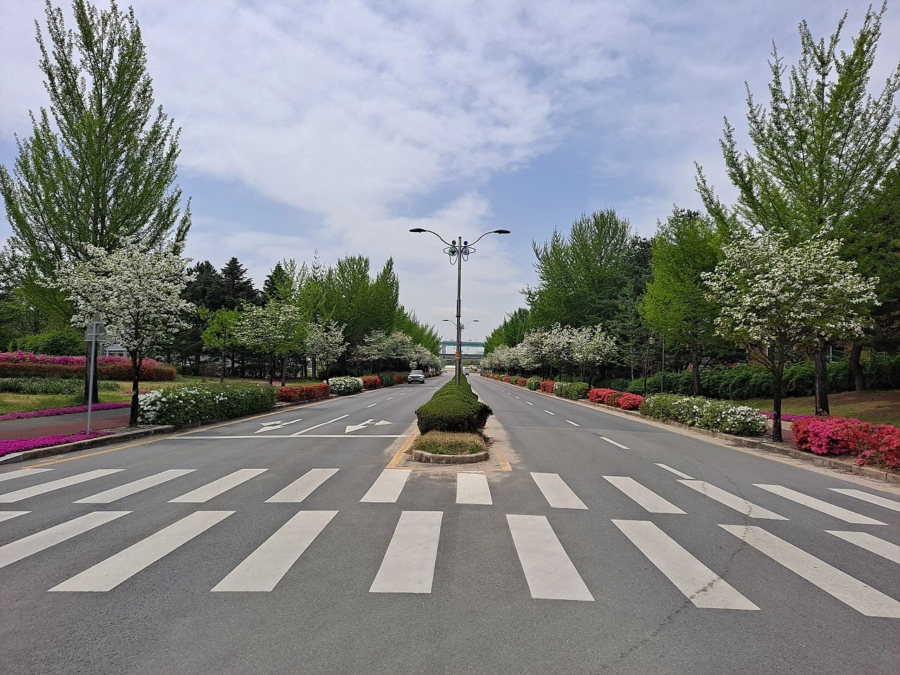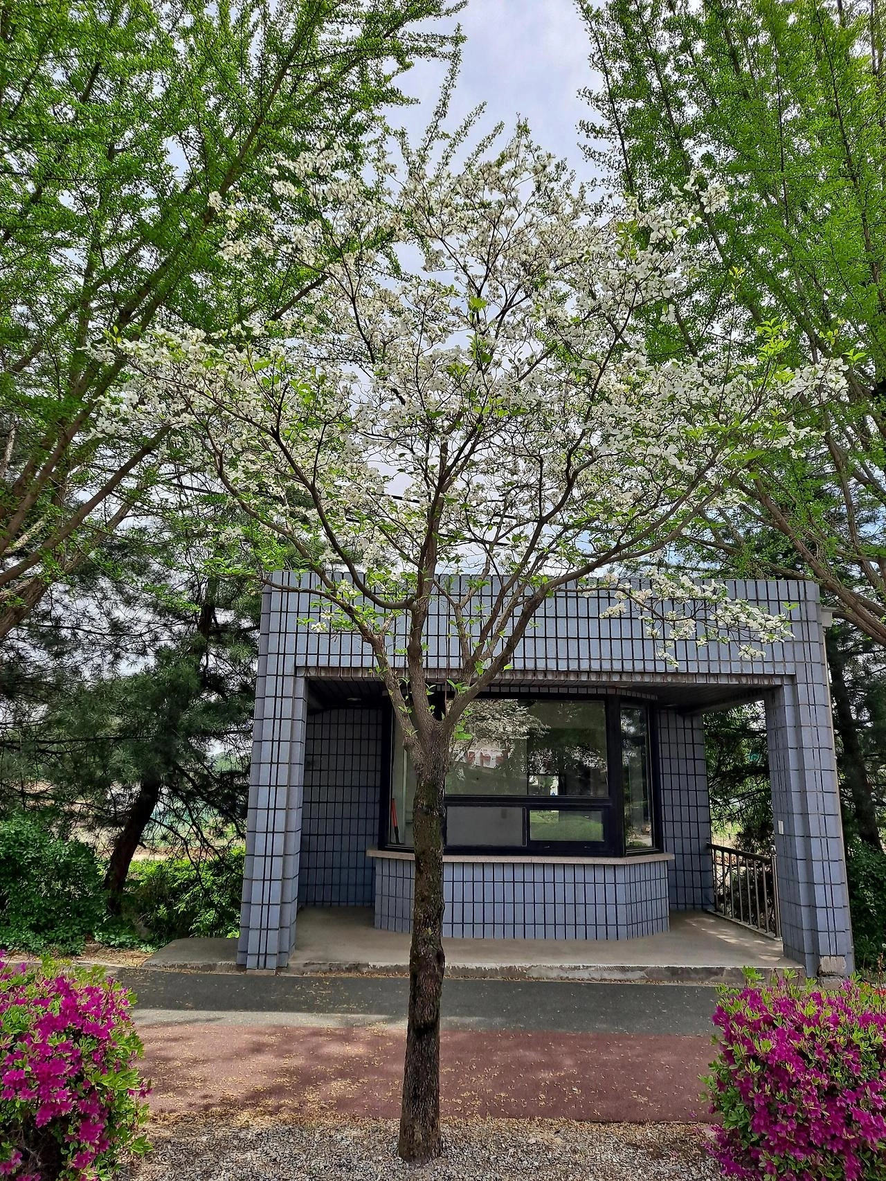 청주 한국교원대학교 정문 캠퍼스 길 녹색 은행나무 앞으로 순결한 하얀색이 도드라진 산딸나무들이 줄지어 서 있다. 4월 말의 산뜻한 캠퍼스 길이다. 산딸나무는 5~6월에 꽃이 피는 거로 알려져 있는데 4월 말에 만개하였다. 온난한 기후 탓인듯하다.