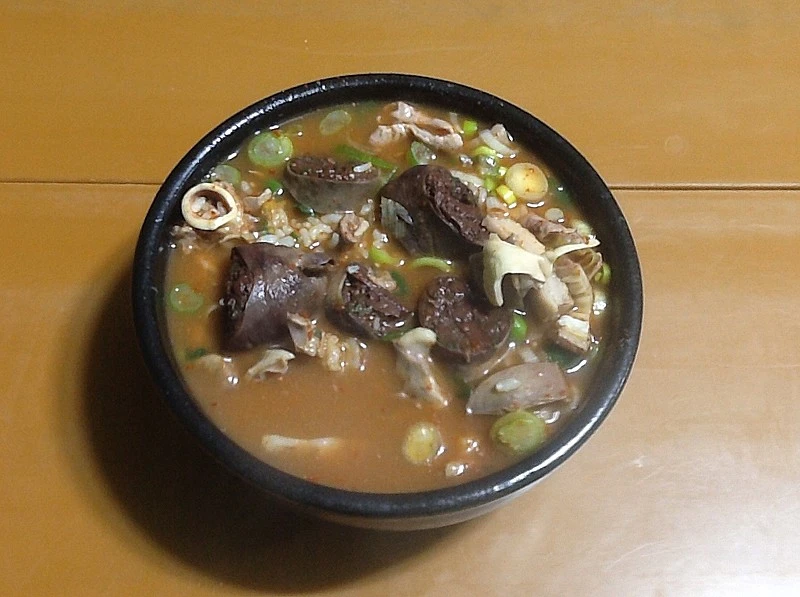 여사장님이 뚝배기에 밥을 담고 돼지 뼈로 푹 곤 육수에 된장을 풀어 끓인 국물로 토렴한다. 돼지 내장과 피순대도 체망에 담아 뜨거운 국물로 토렴해 얹고 육수를 한가득 붓는다. 파란 썬 대파와 빨간 다진양념을 올려 마무리한다.