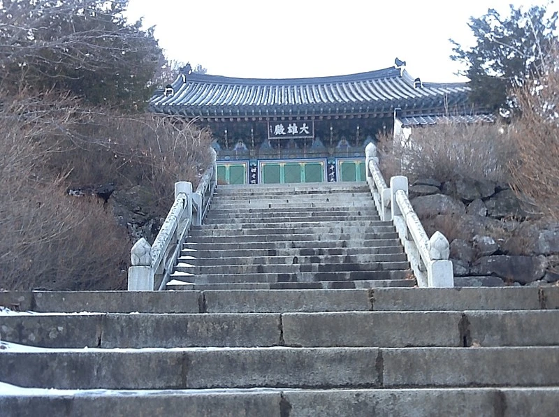 백련사로 하산한다. 백련사 대웅전은 무주 구천동 33경 중 제32경이다.