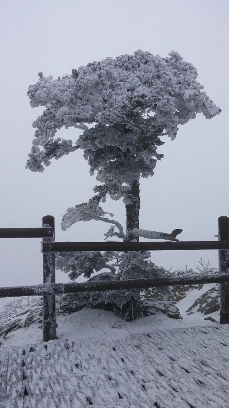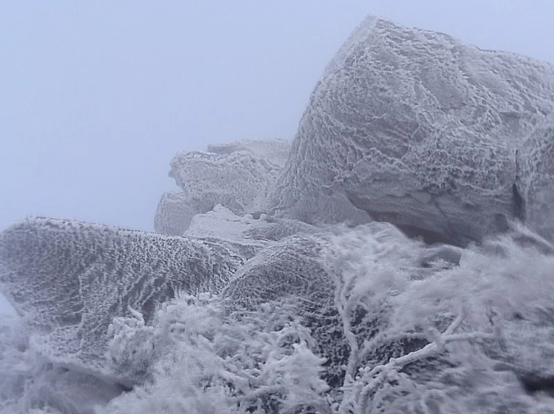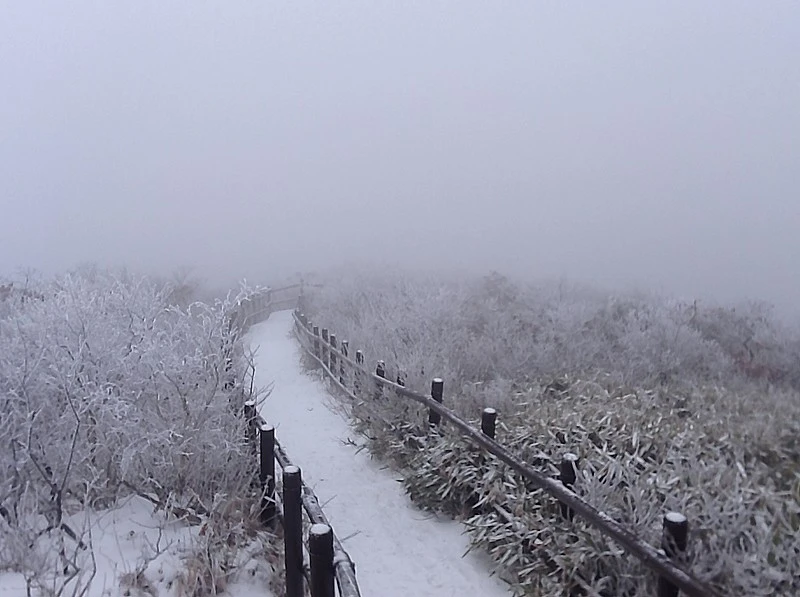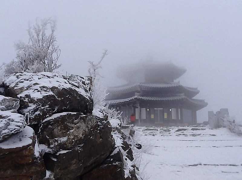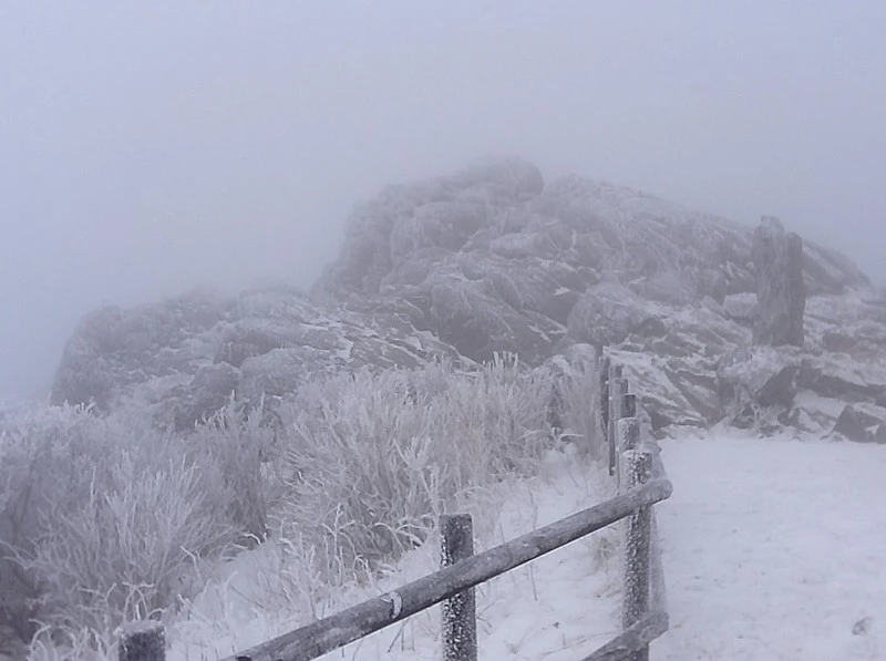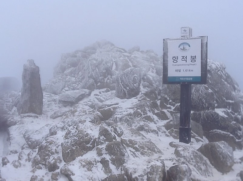 무주 덕유산 정상 향적봉은 무주 구천동 33경 중 제33경이다. 향적봉 주변 바위는 하얗게 얼어 버렸고 안개가 자욱해 경치를 즐길 수 없었다. 정상 표지석의 글씨는 희미하고 알림판의 향적봉 해발 1,614m라 쓰인 글만이 덕유산 정상임을 알게 해준다.