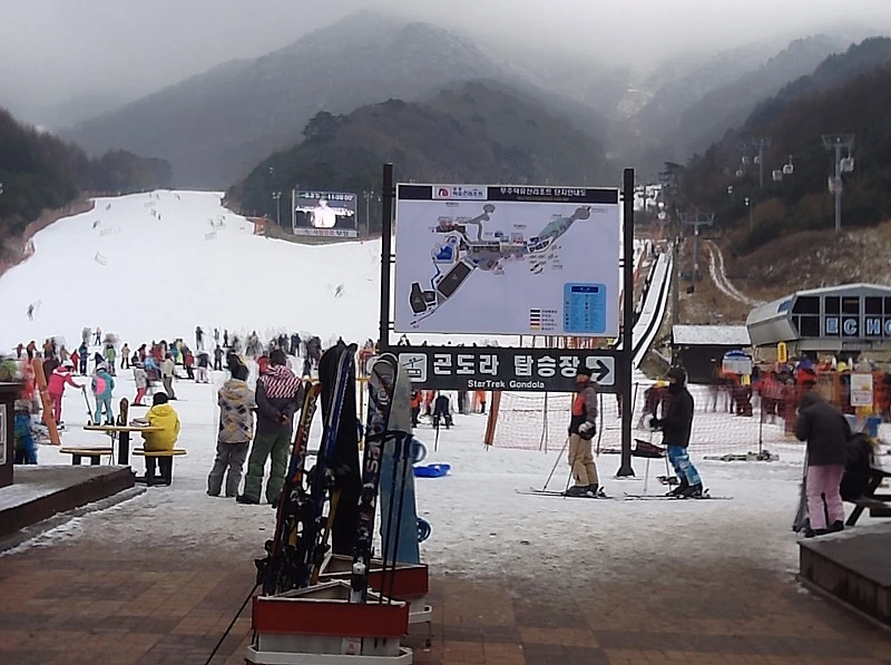 스키장에는 겨울 스키를 즐기는 사람들이 많다. 곤돌라를 타고 설천봉에 오른다.