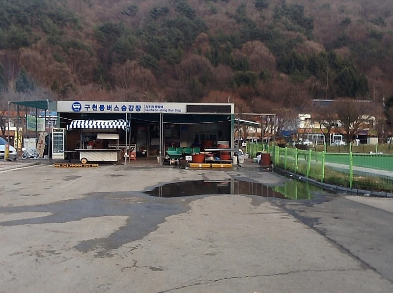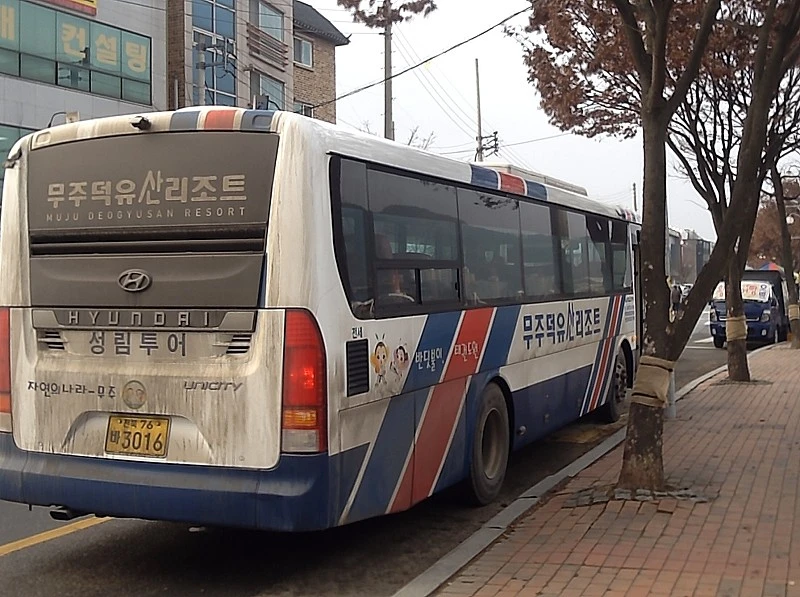 구천동 버스 정류장에서 무주행 직행버스를 타고 무주 공용 버스터미널에 내려 반딧불 시장으로 걸어간다.