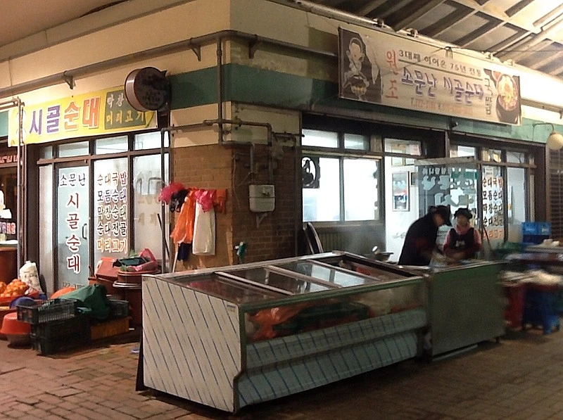 무주 반딧불 시장 안은 환하지 않고 인적도 드물다. 소문난시골순대집 앞에 다다른다. 식당 안 밝은 불이 손님을 반긴다. 식당 문 위에 붙여진 ‘원조, 3대, 75년’ 플래카드를 보며 음식에 대한 기대치를 한껏 끌어 올린다.