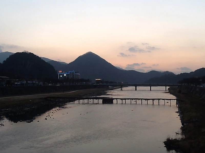 남대천에는 섶다리가 놓여있고 물은 느릿하게 흐른다. 검은 산 뒤로 노을이 옅다. 어둑해진 무주는 차분하다.