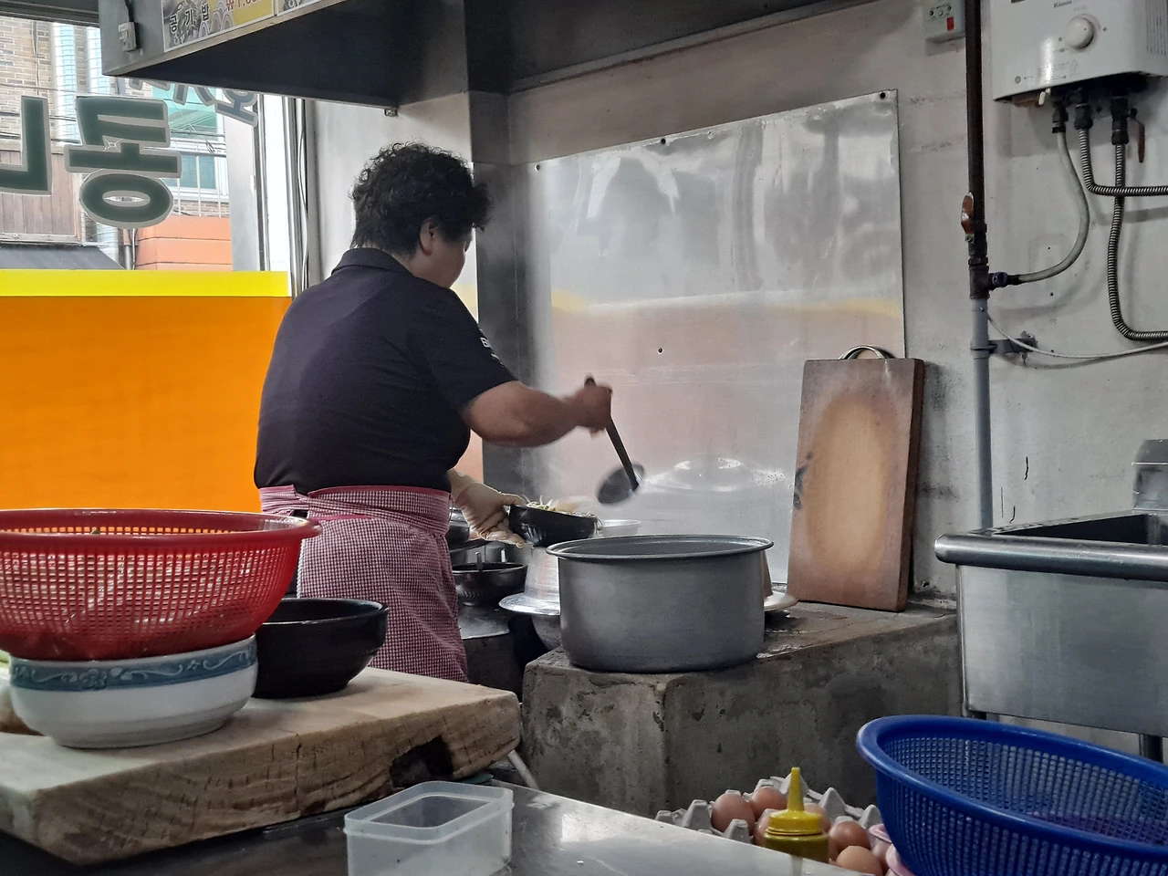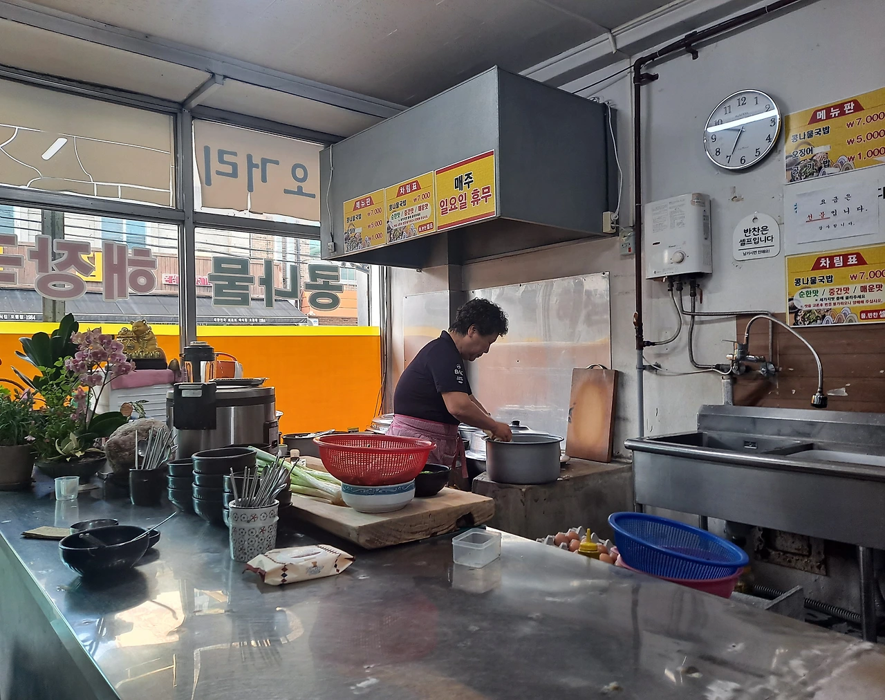 식당 안을 살펴본다. 식당 좌측 끝엔 두 개의 솥에서 육수가 끓고 있고, 솥 앞 스테인리스 테이블엔 밥통과 뚝배기, 커다란 나무 도마가 놓여 있다. 여사장님이 콩나물해장국을 담아 내기 위한 최적의 동선을 만든 공간이다.