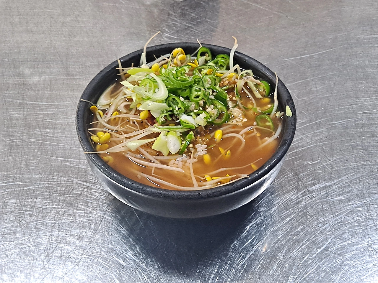 뚝배기에 다져서 얹어진 대파, 청양고추, 마늘과 고춧가루를 숟가락으로 휘저어 국물과 섞는다. 크게 한술 떠 입에 밀어 넣는다.