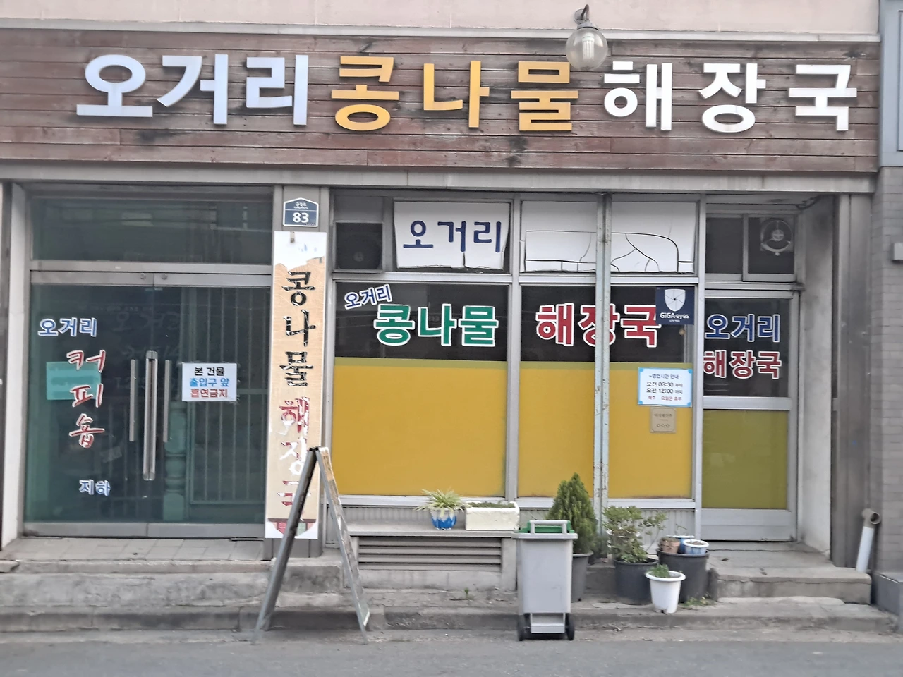 아침 6시 전, 식당 앞에 다다른다. 출입문 위 나무에 큰 글씨로 쓴 식당 이름이 붙어 있다. 오거리와 해장국은 흰색이고 콩나물은 노란색이다. 콩나물이 주인공임을 간판에서도 알 수 있다.