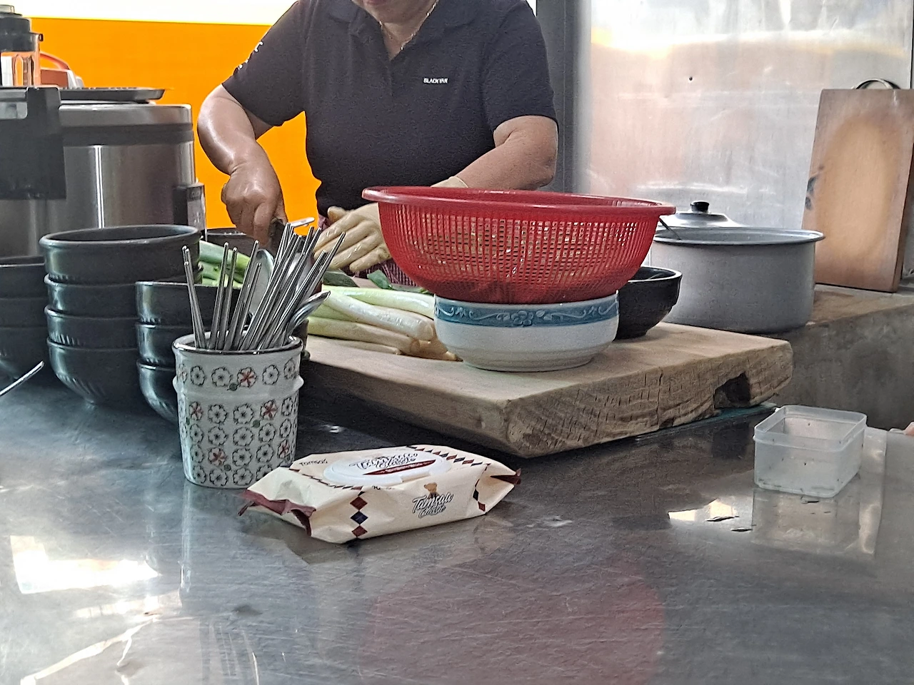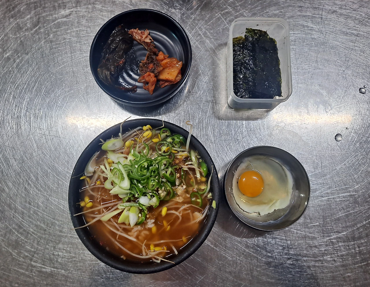 여사장님은 김통과 수란을 먼저 내주고 육수가 끓고 있는 솥으로 간다. 나그네는 반찬통이 놓인 곳으로 가 작은 접시에 밑반찬을 담아 자리에 앉는다.