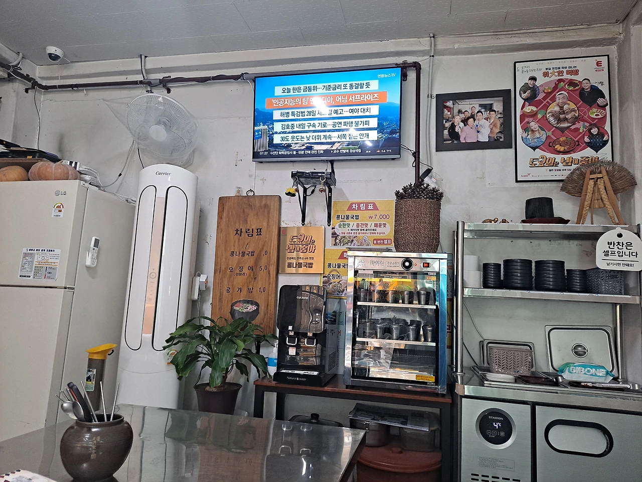 앉은 자리 앞으로는 설거지하는 싱크대와 차림표, 시계가 걸려 있다. 깔끔하게 밥그릇과 뚝배기를 넣은 선반도 보인다. 우측으로 눈을 돌려보니 냉장고와 에어컨, 차림표, TV, 정수기, 물컵 자외선 소독기, 반찬통 등이 보인다. 방송 출연한 사진도 눈에 띈다.