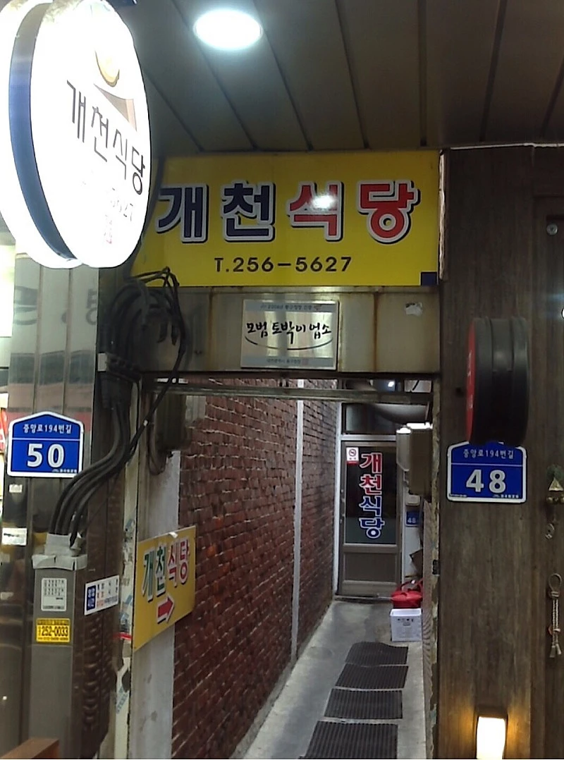 개천식당을 처음 찾아 먹었던 기억을 떠올린다. 대전 중앙시장을 헤매다 비좁은 골목 입구에서 ‘개천식당’ 상호가 쓰인 노란 간판을 만난다. 모범토박이업소 인증패가 맛에 대한 기대치를 끌어 올린다.