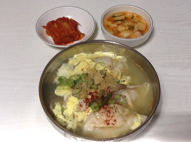 자극적인 맛 덜한 양념의 시큼하고 시원한 배추김치와 삼삼한 동치미 국물 등 밑반찬을 곁들여 먹는다. 단출하지만 만둣국과 잘 어우러진다.