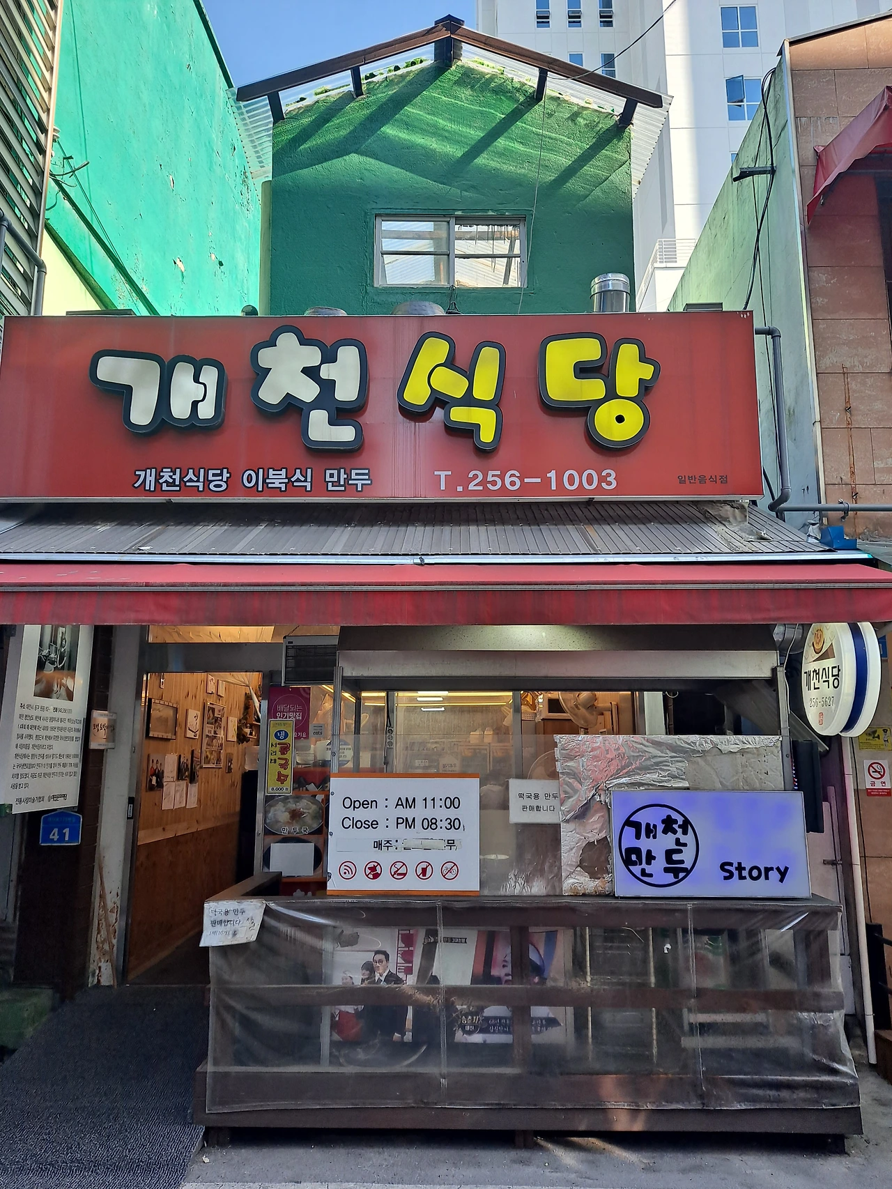 상호가 쓰인 노란 간판이 빨간 간판으로 변했다. 작게 쓰인 개천식당 상호 옆으로 ‘이북식 만두’도 쓰여 있다.