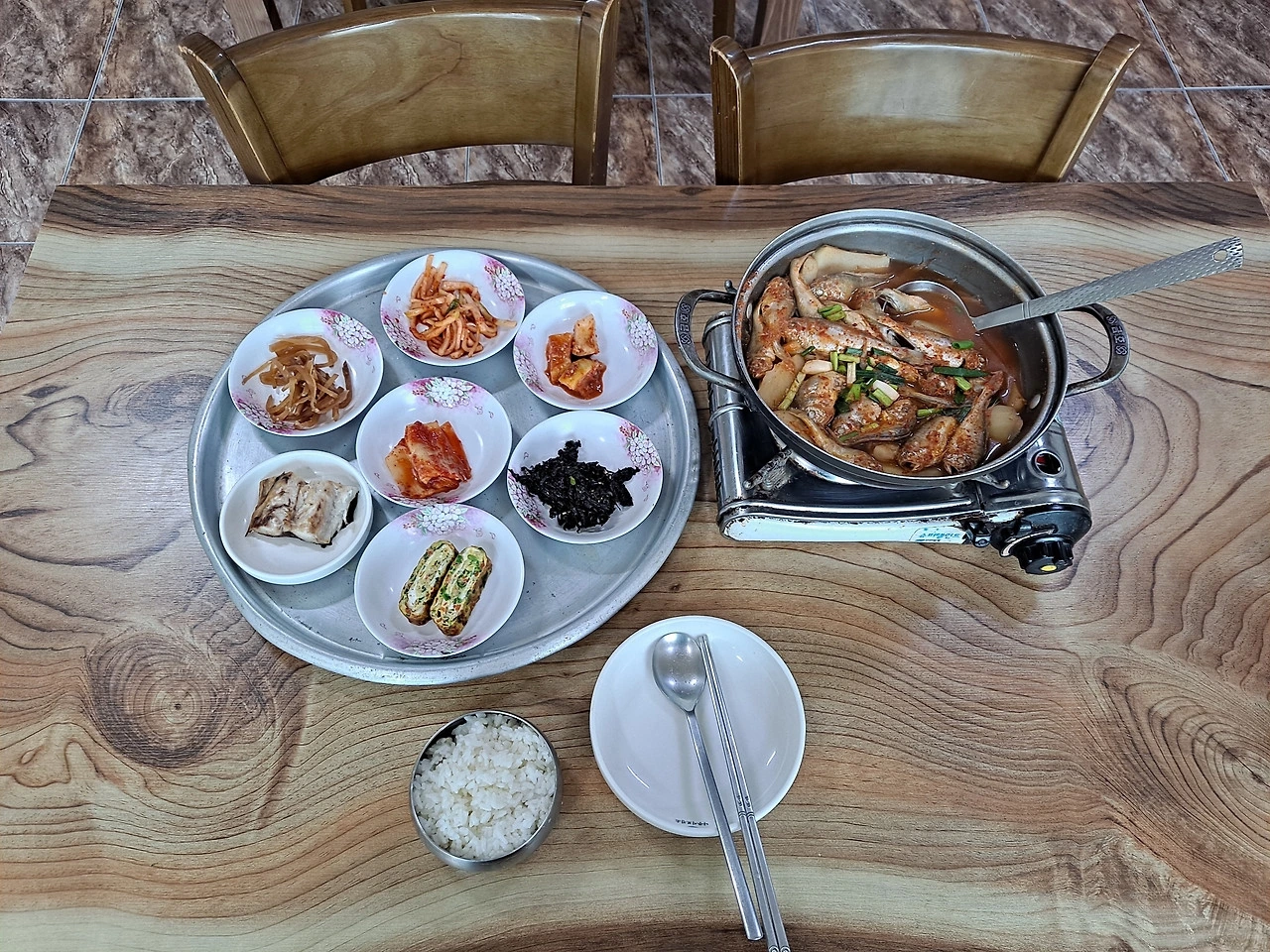 전날 손님들이 많아 밑반찬이 적다며 둥그런 양은 쟁반에 담아 따듯한 밥과 함께 먼저 내준다. 소박하지만 구색이 잘 맞는 정성이 담긴 밑반찬들이다. 겹치는 찬들만 많은 남도의 한정식집보다 낫다.