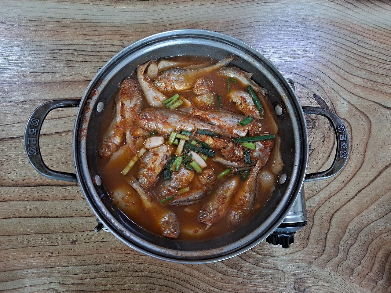 고춧가루와 갖은양념에 황석어, 감자를 넣어 끓인 후 썬 파를 살짝 올린 황석어 찌개를 내온다. 휴대용 가스레인지에 올려 준다. 따뜻하게 먹게 하려는 배려다. 약하게 불 조절 해서 끓이며 먹는다.