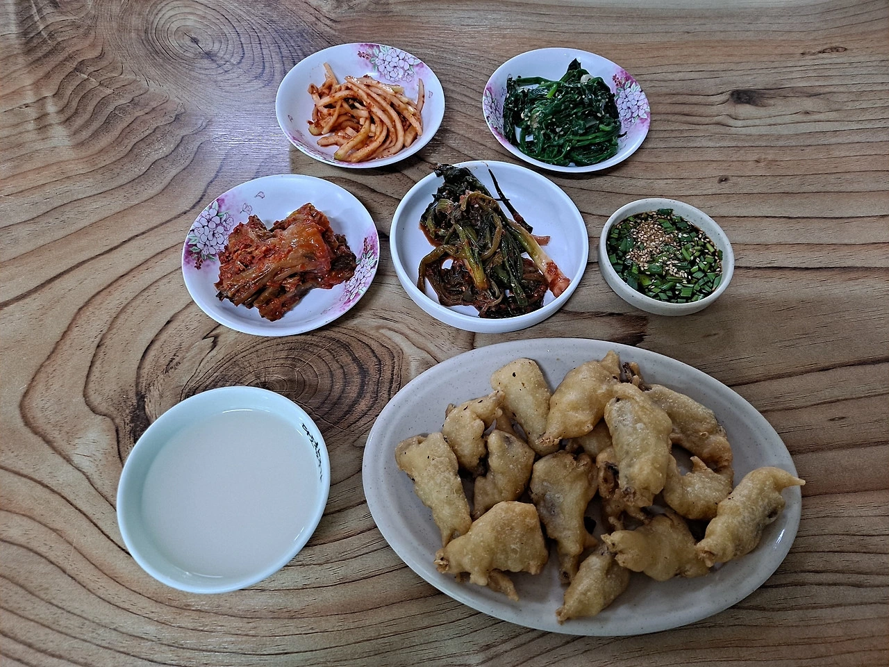 무생채, 나물무침도 함께 맛본다. 막걸리에 자꾸 손이 가게 하는 황석어 튀김과 밑반찬들이다. 궁합이 잘 맞는 막걸리 단짝들이다.