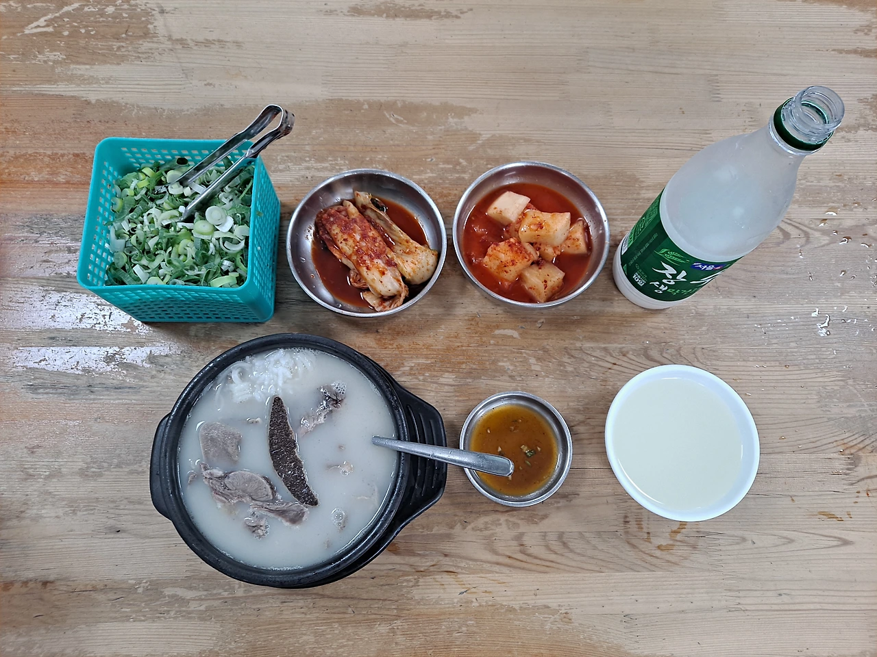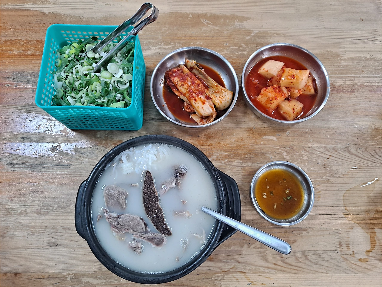 설렁탕에 배추김치와 깍두기를 곁들여 먹다가 얼마 남지 않은 국물에 깍두기 국물을 풀고 썬 대파도 추가한다.