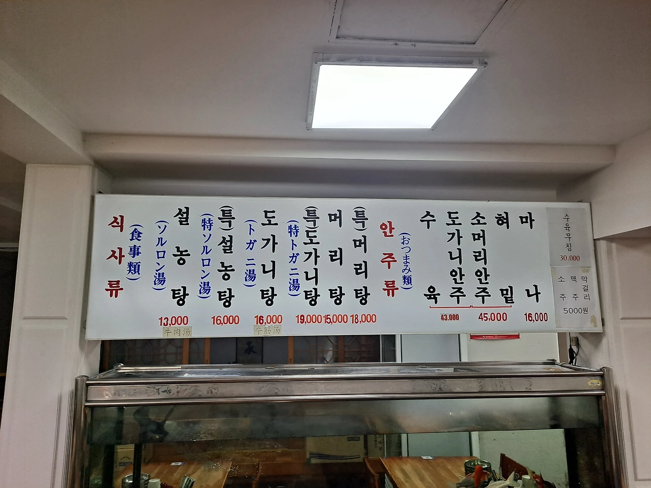 식사류인 설농탕(1만4천원, 특 1만7천원), 머리탕(1만6천원, 특 1만9천원), 도가니탕(1만7천원)과 안주류인 수육, 도가니안주(각 4만4천원), 소머리안주, 혀밑(각 4만6천원), 마나(1만6천원)등을 판매한다.