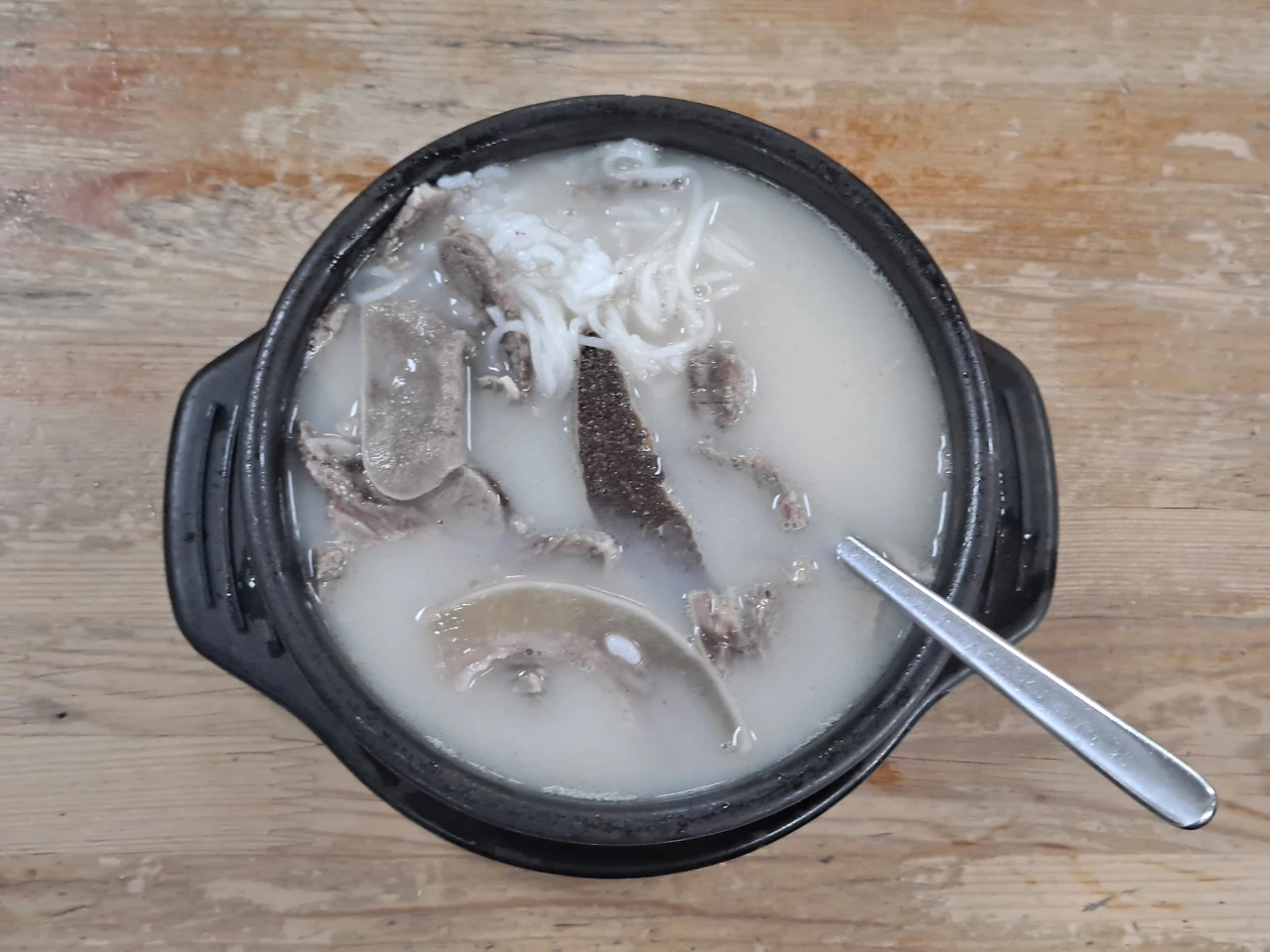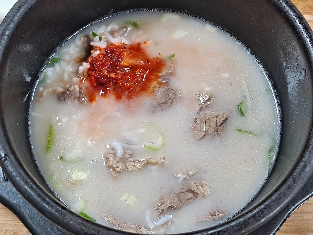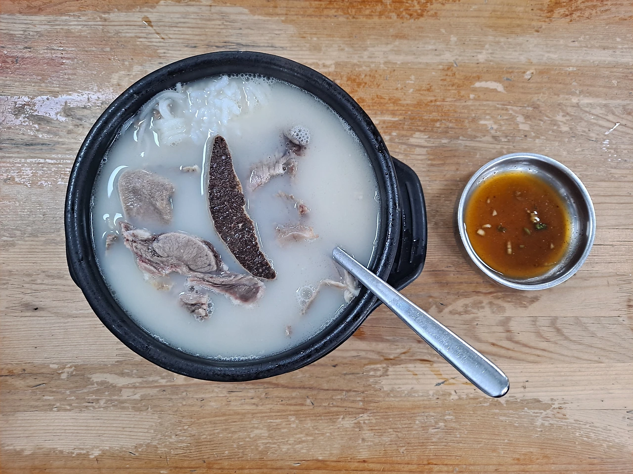 숟가락을 뚝배기에 깊숙이 넣어 건더기와 국물을 함께 떠 입에 넣는다. 양지, 우설, 머리 고기, 마나 등 소의 다양한 부위가 다른 식감과 맛으로 어금니와 혀를 놀린다. 건더기의 양도 넉넉하다. 따스한 온도로 맞춰진 토렴 된 밥알은 국물과 함께 부드럽게 넘어간다. 숟가락질이 반복될수록 속은 편하고 든든해진다.