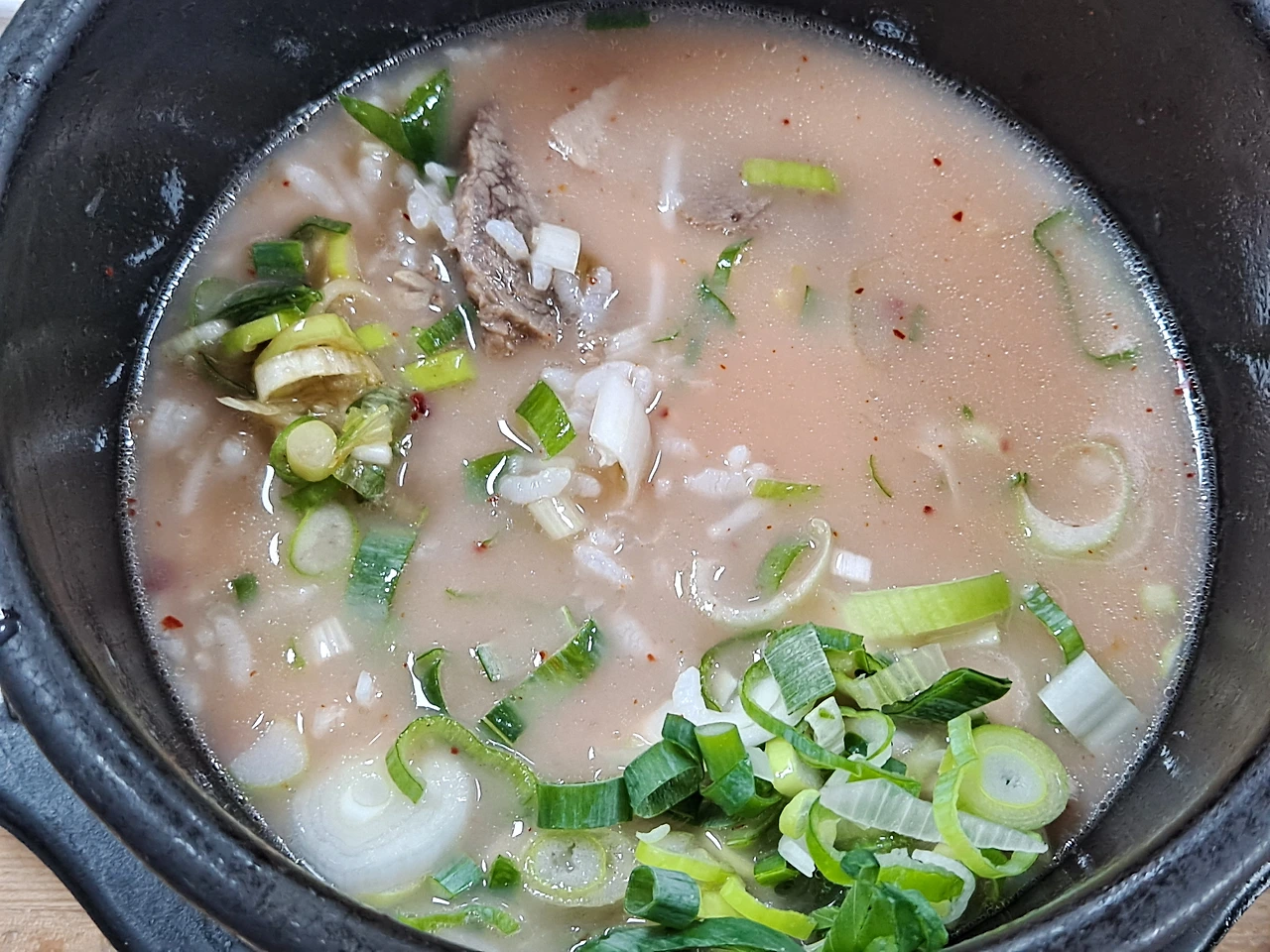설농탕은 눈처럼 희거나 일반 식당의 설렁탕보단 국물이 뽀얗지 않다. 검은 뚝배기에 탁한 쌀뜨물 같은 국물이 남실거린다. 국물 위에선 갈색빛 소고기와 다크초콜릿 빛을 띠는 반달 모양의 마나(소의 비장)가 또렷하게 존재감을 드러내고 국물보다 하얀 밥알과 국수사리도 살며시 보인다. 썬 대파를 집게로 집어 넣는다. 푸름이 더해진다.