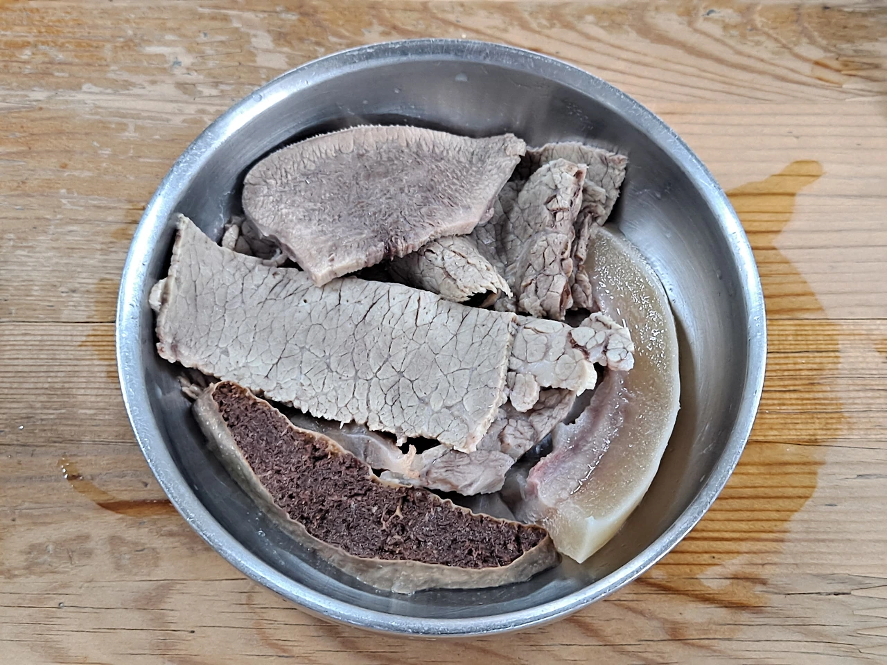 설농탕의 고명으로 사용한 머리 고기, 양지, 우설, 마나 등은 소의 허드레 부위다. 막걸리 한잔 걸치고 양념간장에 찍어 고루 먹는다.