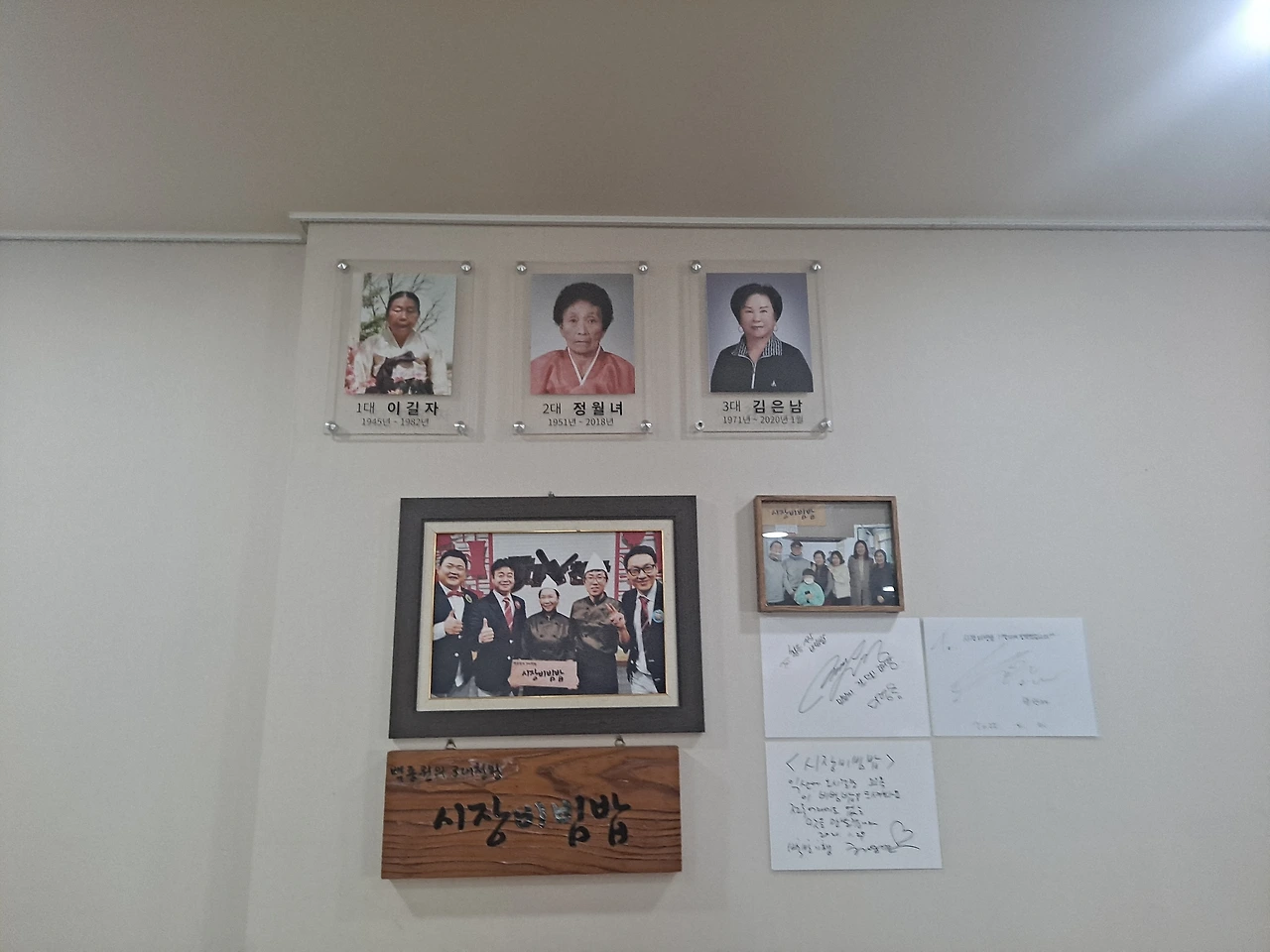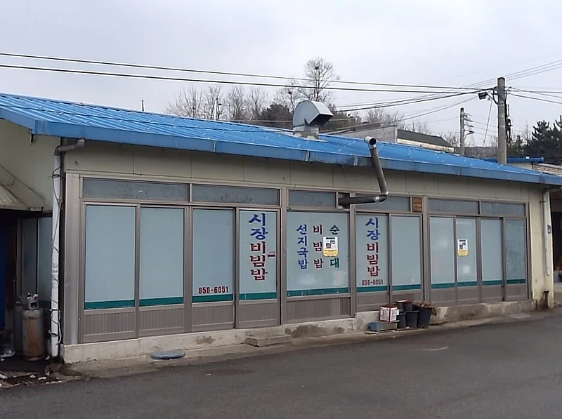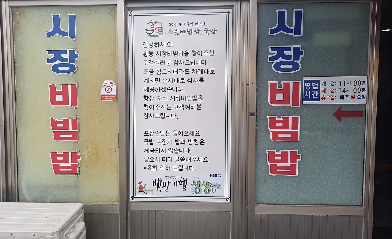 말을 마치고 식당을 살펴본다. 가건물 같은 허름한 식당의 외관은 크게 변하지 않았다. 출입문 위 지붕에 시장비빔밥 상호가 적힌 간판이 새로 달렸고 방송에 소개된 스티커도 붙어 있다.