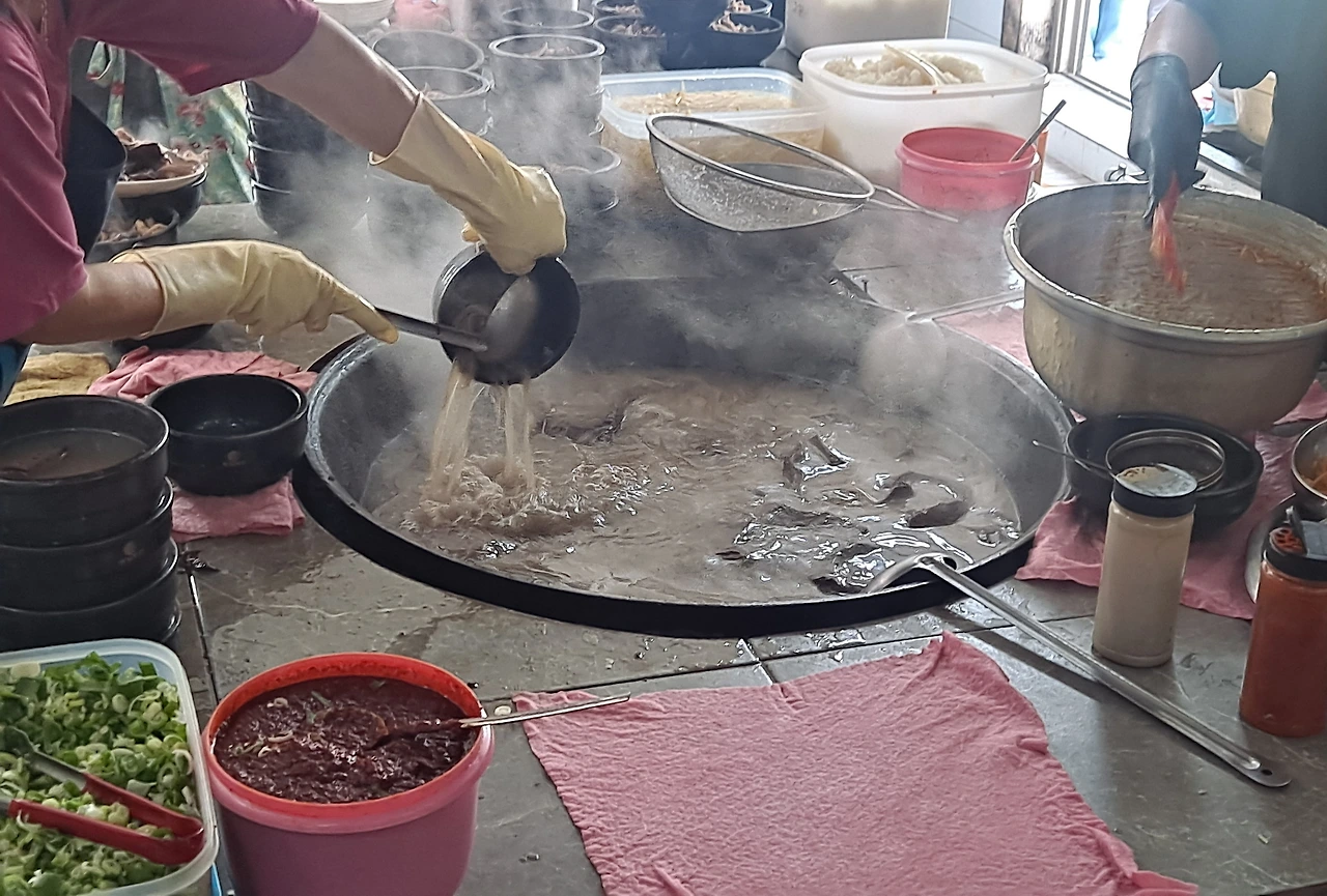 무쇠솥 주위에선 분배와 규칙적인 동작으로 음식을 만들어낸다. 무쇠솥 국물은 국밥과 비빔밥용으로 동시에 사용된다. 왼쪽에선 선지순대국밥용 돼지 내장이 담긴 검은 뚝배기에 토렴하고 오른쪽에선 육회비빔밥용 콩나물이 얹힌 식은 밥을 큰 체망에 넣고 돼지고기 육수, 선지, 피순대가 뒤섞인 무쇠솥 국물에 담가 국자로 누르며 토렴한다. 열을 고루 전달하는 무쇠솥은 식재료들 본연의 질감을 살리면서 부드럽게 익혀준다.