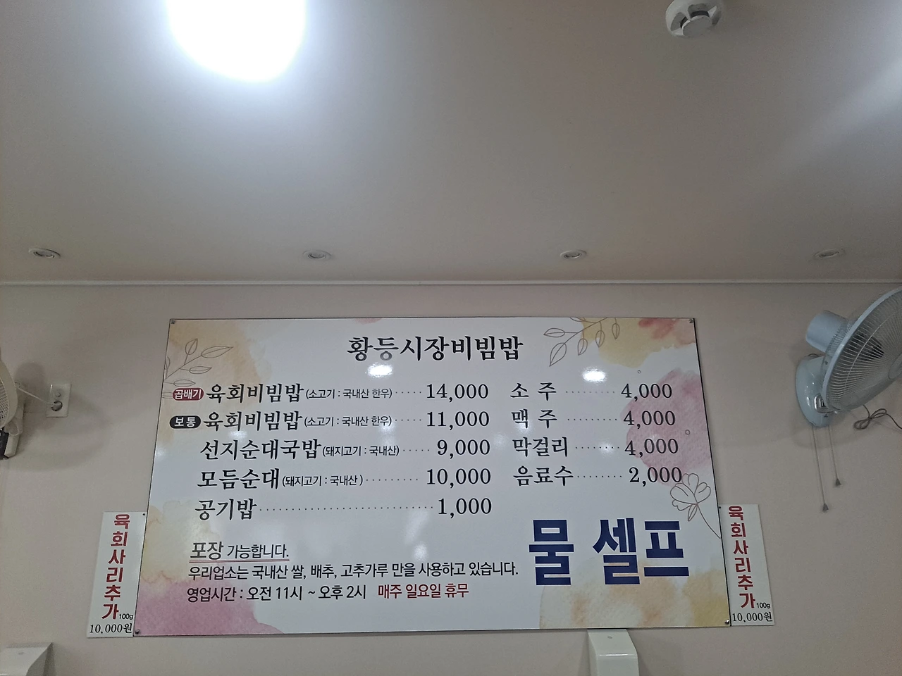 육회비빔밥 보통 1만 1천 원, 곱빼기는 1만 3천 원이다. 선지순대국밥(9천 원), 모듬순대(1만)도 판매한다. 영업시간은 11시~14시로 하루 3시간만 장사한다. 일요일은 휴무이다.