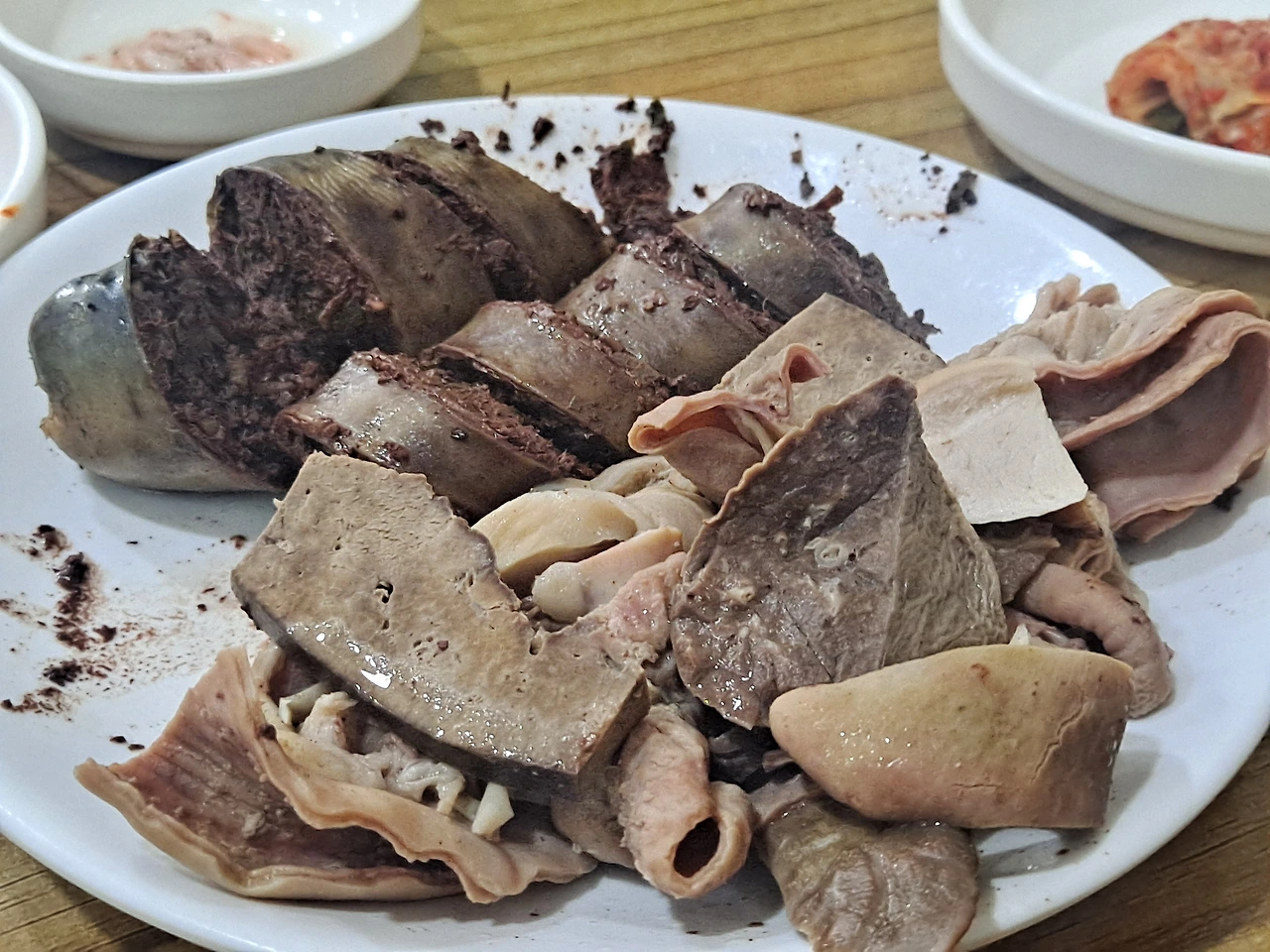 5분쯤 지나 모듬순대에 깍두기, 김치, 새우젓을 곁들여 내준다. 모듬순대는 피순대와 돼지 내장이 섞여 있다.