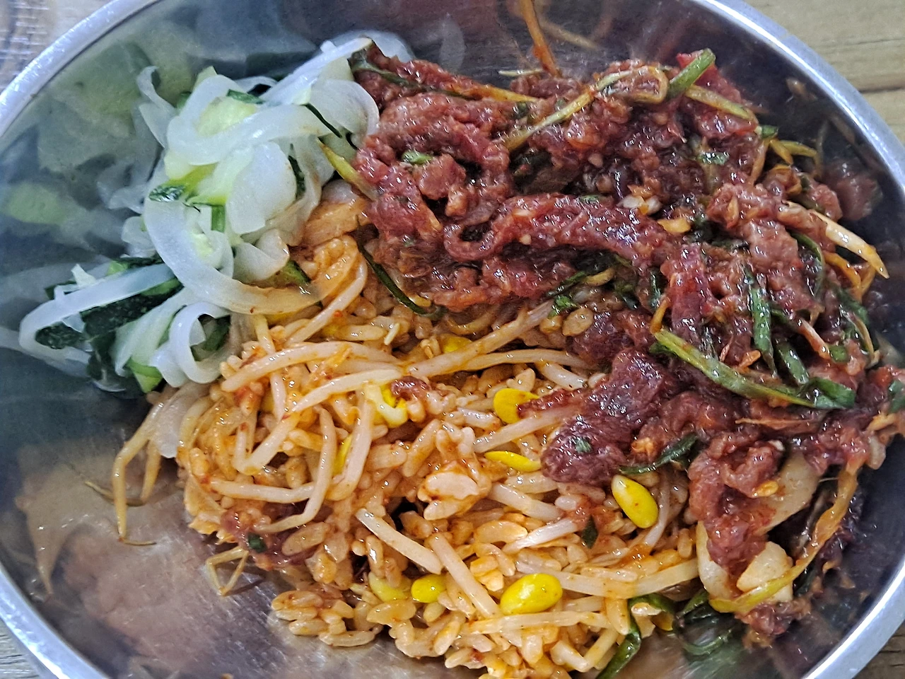 2016년 맛본 사진을 보며 추억의 맛을 되새긴 후 자리에 놓인 육회비빔밥을 찬찬히 훑어본다. 담음새가 한 달 전 맛본 진미식당에 비해 투박하다. 채소들로 색은 냈지만, 빨간 육회의 양이 많아 묻힌다. 푸른 시금치 무침은 보이지 않고 파무침과 함께 버무려진 육회의 색감은 예전보다 덜 자극적이다.